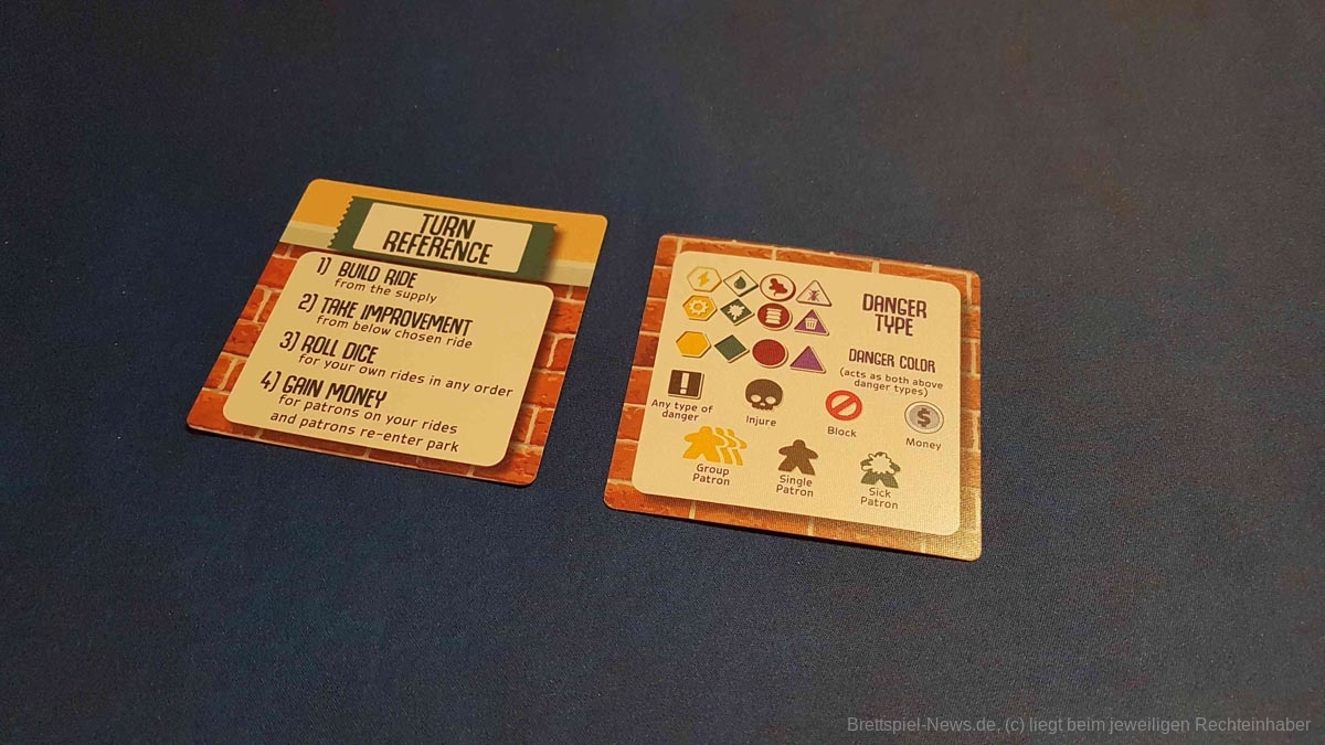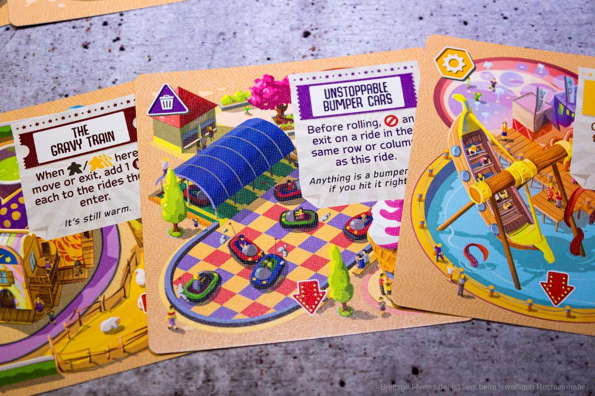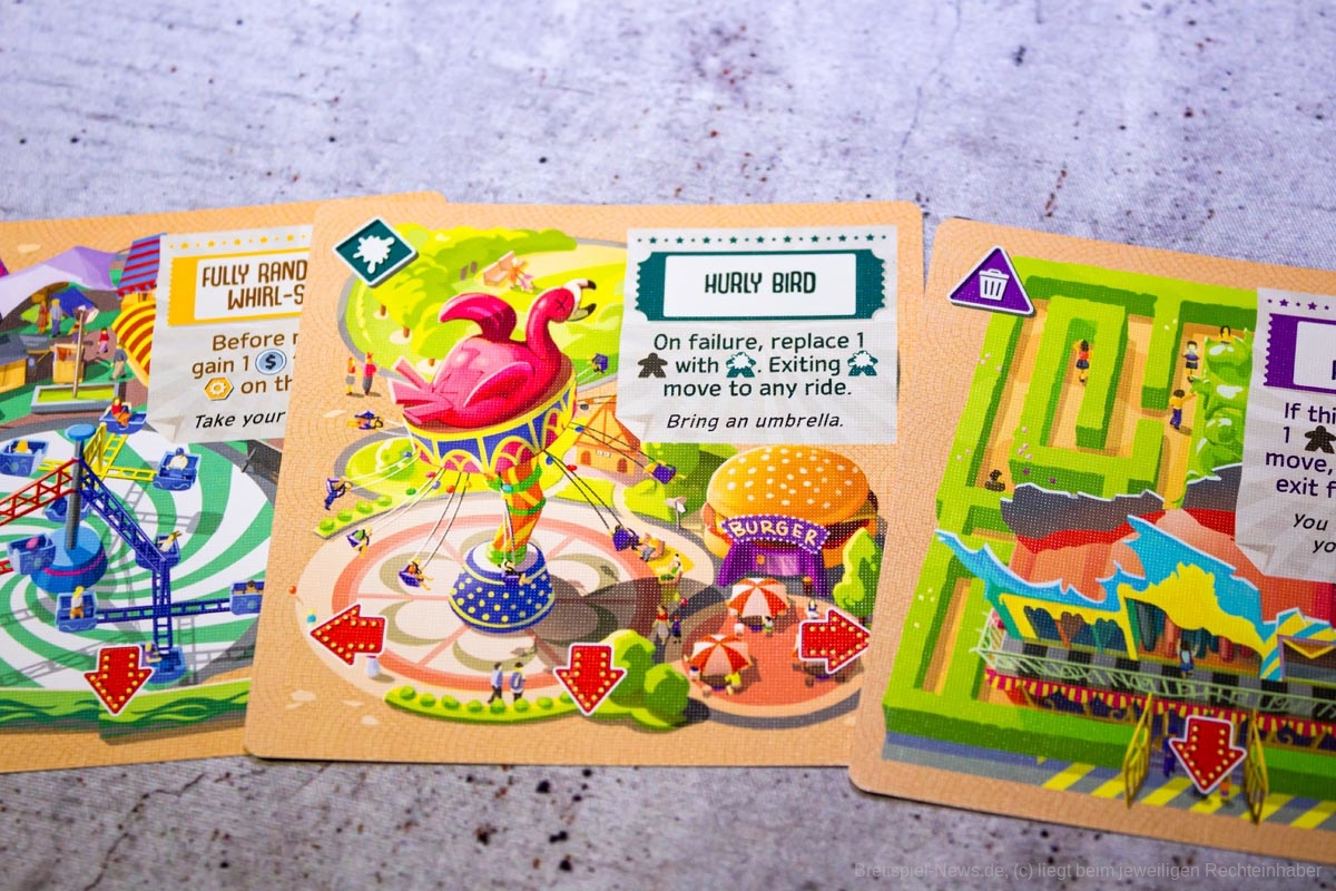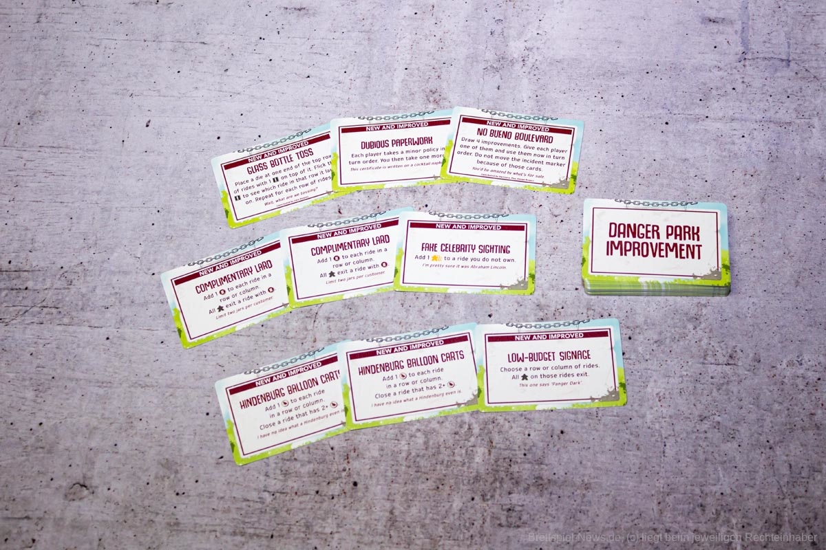Positiv hervorzuheben sind dafür die kranken Besucher sowie die umfangreichen Aktionsmöglichkeiten, welche sich beim Aktivieren der Verbesserungskarten ergeben. All dies gibt „Danger Park“ die nötige Tiefe. Durch die geheimen Ziele entsteht zudem eine kleine Portion Nervenkitzel während des Spiels, was selbstredend in einem Vergnügungspark nicht fehlen darf. Für einen hinreichenden Wiederspielreiz sorgen auch die zahlreichen Verbesserungskarten und Attraktionen.