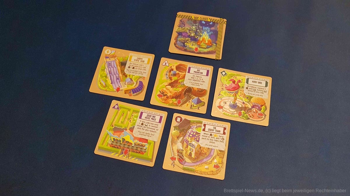 Gespielt wird über mehrere Runden, die allesamt nach dem gleichen Muster ablaufen. Die Person, welche gerade am Zug ist, muss zunächst aus der Auslage eine Attraktion auswählen und senkrecht oder waagrecht an eine bestehende Attraktion anlegen. Auf jede neue Attraktion kommt ein Gefahrenplättchen sowie zwei gewöhnliche Kunden. Während die Gefahrenplättchen irgendwann dafür sorgen, dass die Attraktion geschlossen werden muss, generieren Kunden weitere Einnahmen. Wichtig beim Platzieren ist übrigens, dass die Ausgänge des Fahrgeschäftes möglichst so gelegen sind, dass die Kunden danach auch wieder bei einer eigenen Attraktion anstehen.
