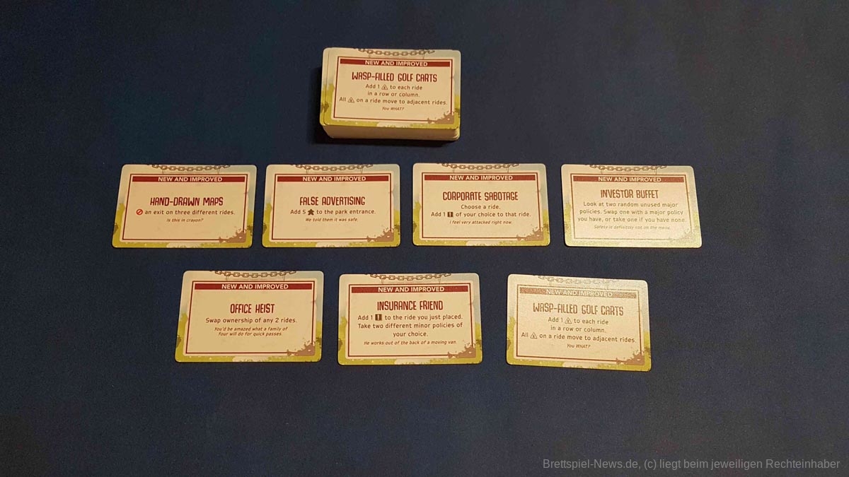 Im zweiten Schritt erhält die Person noch eine Verbesserungskarte, welche sofort ausgeführt werden muss. Dadurch kann es beispielsweise passieren, dass alle Kunden auf Attraktionen in einer Spalte bewegt werden, Kunden einen Unfall haben oder erkranken. Kranke Kunden hinterlassen am Ende des Zugs übrigens Erbrochenes bei den Attraktionen, was die Anzahl an Gefahrenplättchen schnell in die Höhe treiben kann. Außerdem können kranke Besucher nicht zu besonders gewinnträchtigen Gruppen zusammengefasst werden.