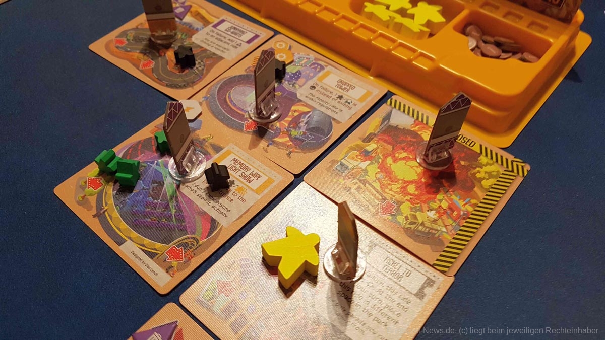 Irgendwann überschreitet eine Attraktion dann die zulässige Zahl an Gefahrenplättchen, wodurch es zu einem dramatischen Unfall kommt infolgedessen die Attraktion geschlossen werden muss. Alle Besucher verlassen diese dann augenblicklich. Die betroffene Person erhält eine kleine Versicherungspolice als Ausgleich. Wenn später eine weitere Attraktion in einer bestimmten Farbe schließt, erhält die Person eine finanzielle Entschädigung. Wenn doch nur alle Versicherungen so unkompliziert wären. Aber zurück zur Sache.
