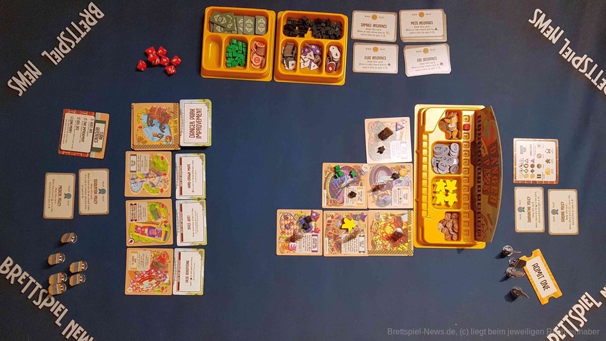 Ich hatte leider auch allzu oft das Gefühl, vom Spiel gespielt zu werden und somit die Kontrolle über meine taktischen Entscheidungen weitestgehend zu verlieren. Das ist bei „Danger Park“ vor allem dann der Fall, wenn gleichzeitig mehrere der eigenen Attraktionen zerstört werden. In so einer Spielsituation ist es dann meist am sinnvollsten, kurzfristig auf die Ausschüttung der kleinen Versicherungspolicen zu setzen.