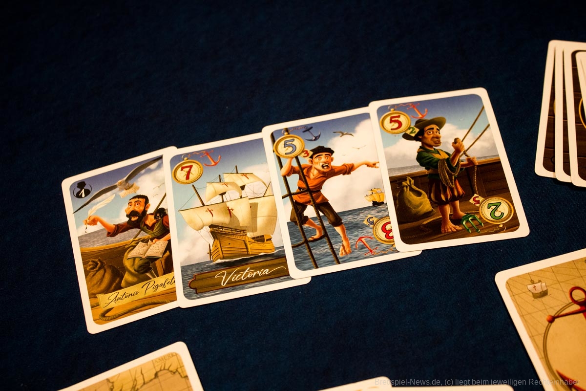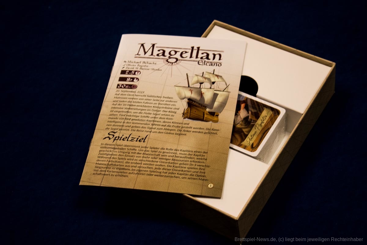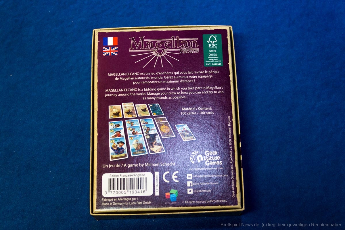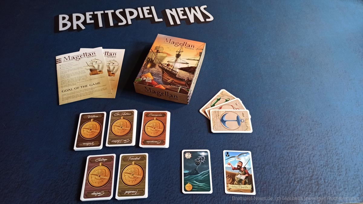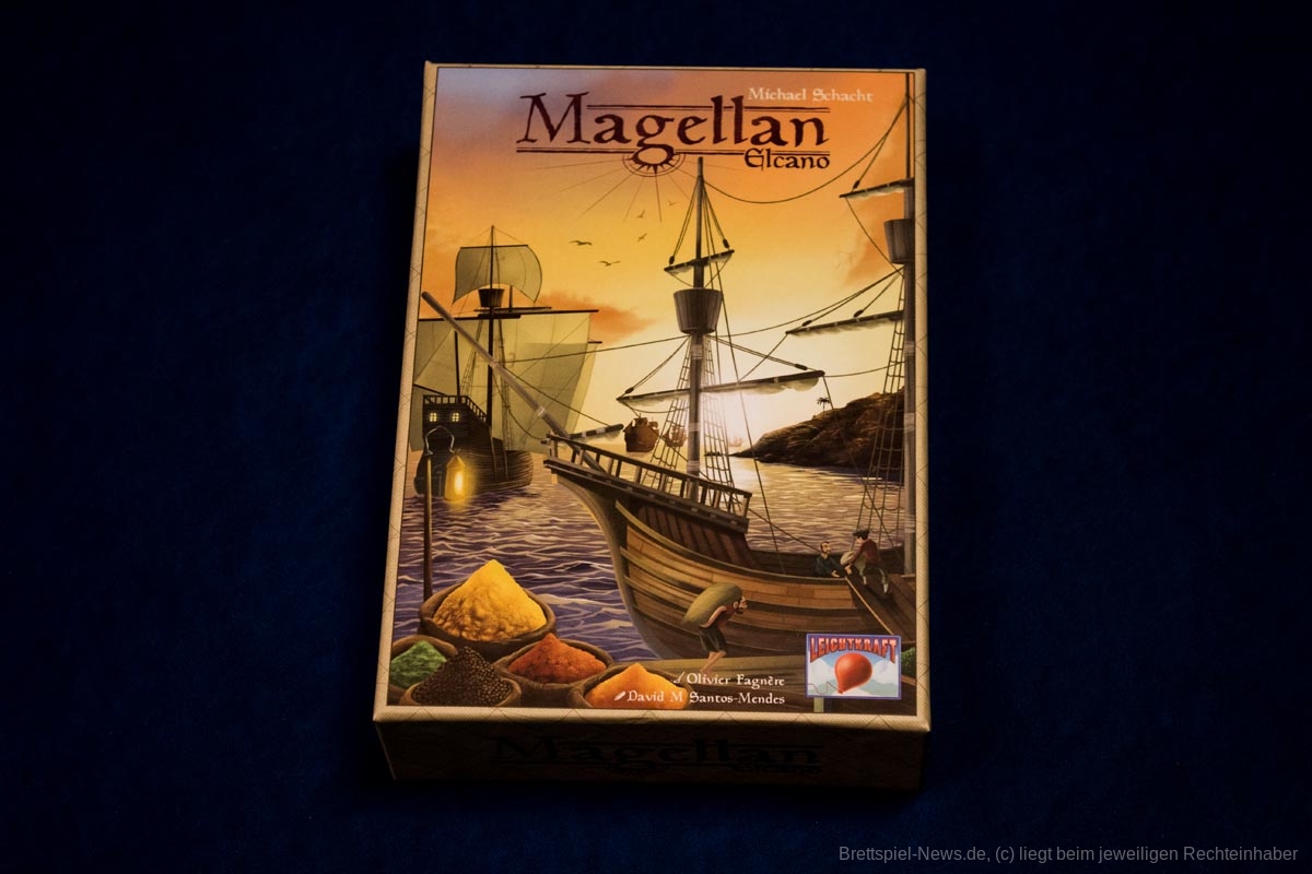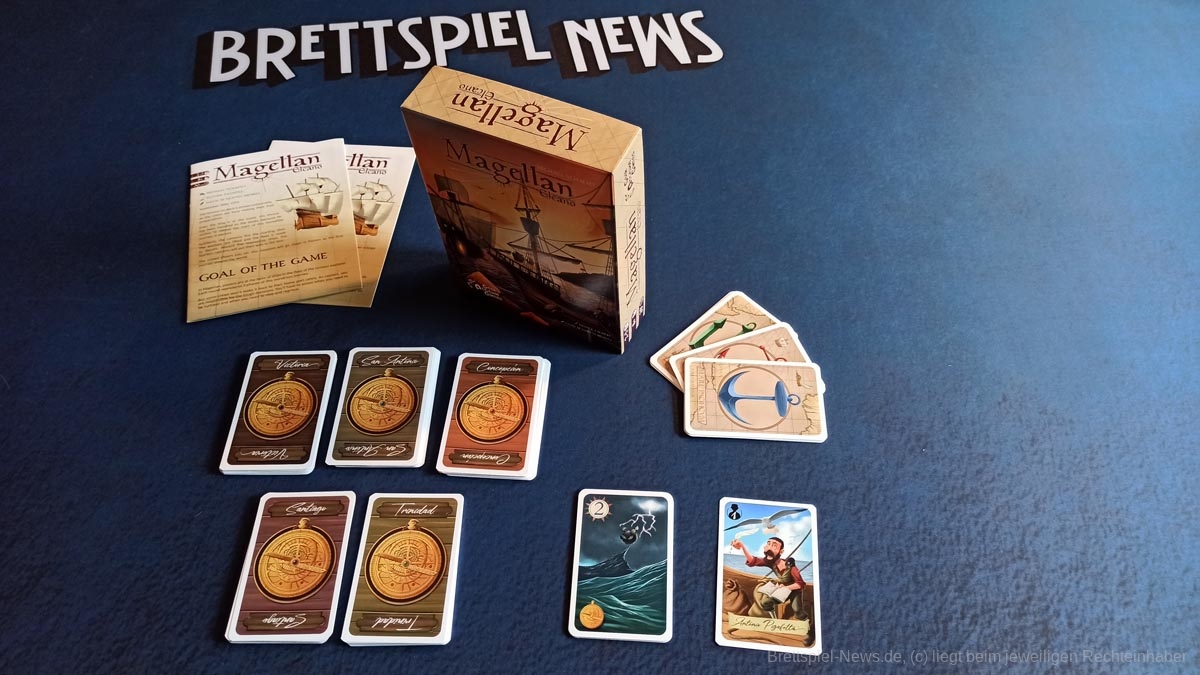 „Magellan“ ist ein Karten basiertes Biet-Spiel auf Familienspiel-Niveau, das in einer kompakten Spielschachtel verstaut ist, die allerdings immer noch zu 50% mit Luft gefüllt ist. Das Titelbild ist stimmig, passt aber nicht so recht zum restlichen Spielmaterial, das in buntem Comic Stil illustriert wurde. Beide Stile gefallen uns, passen nur nicht wirklich zusammen.