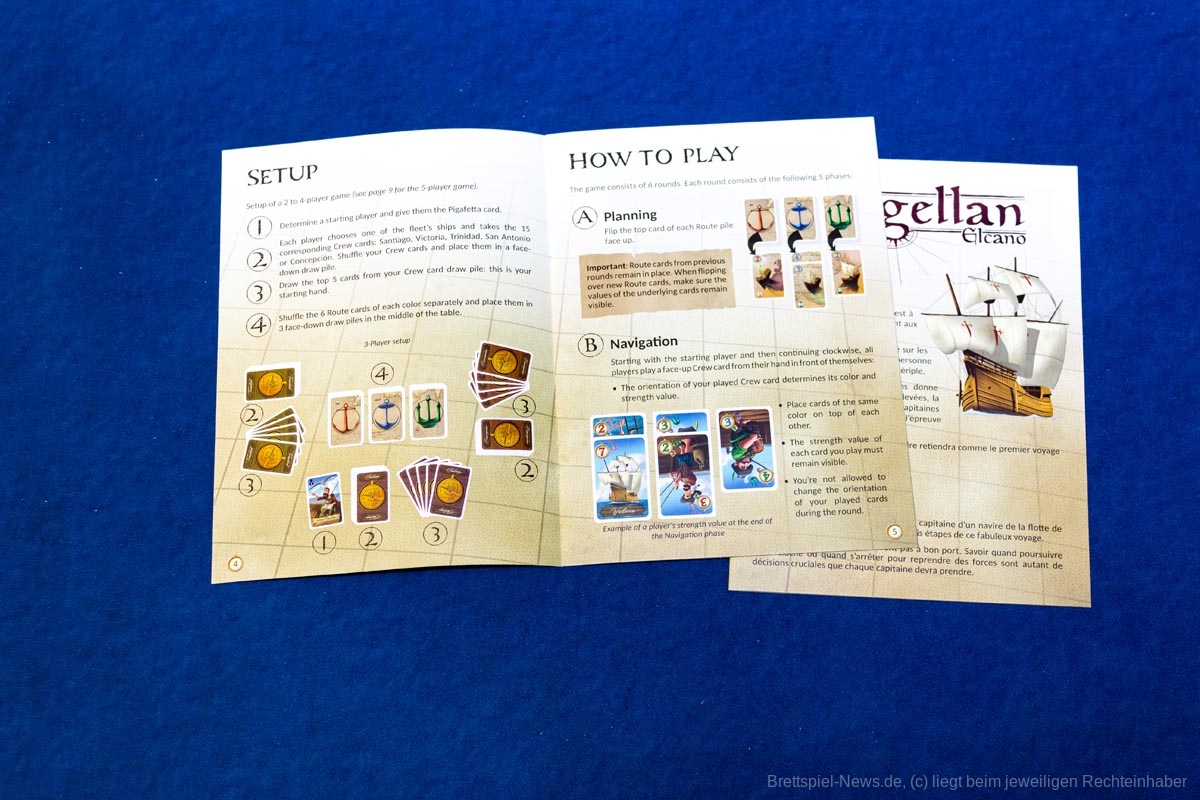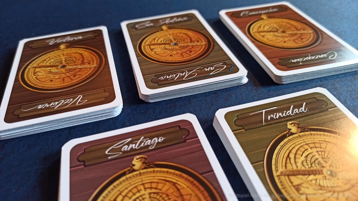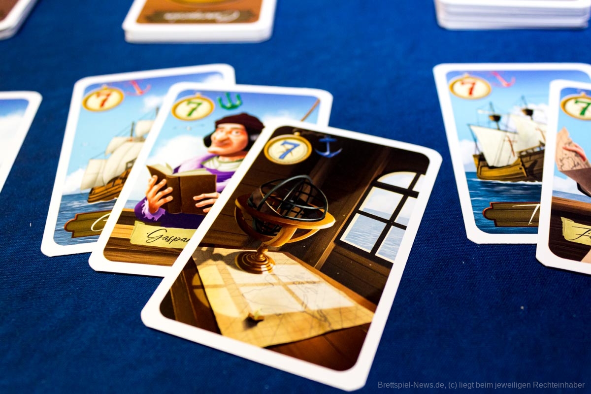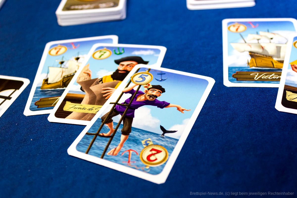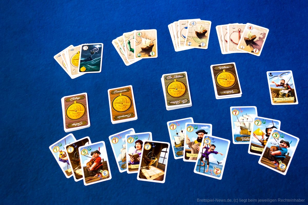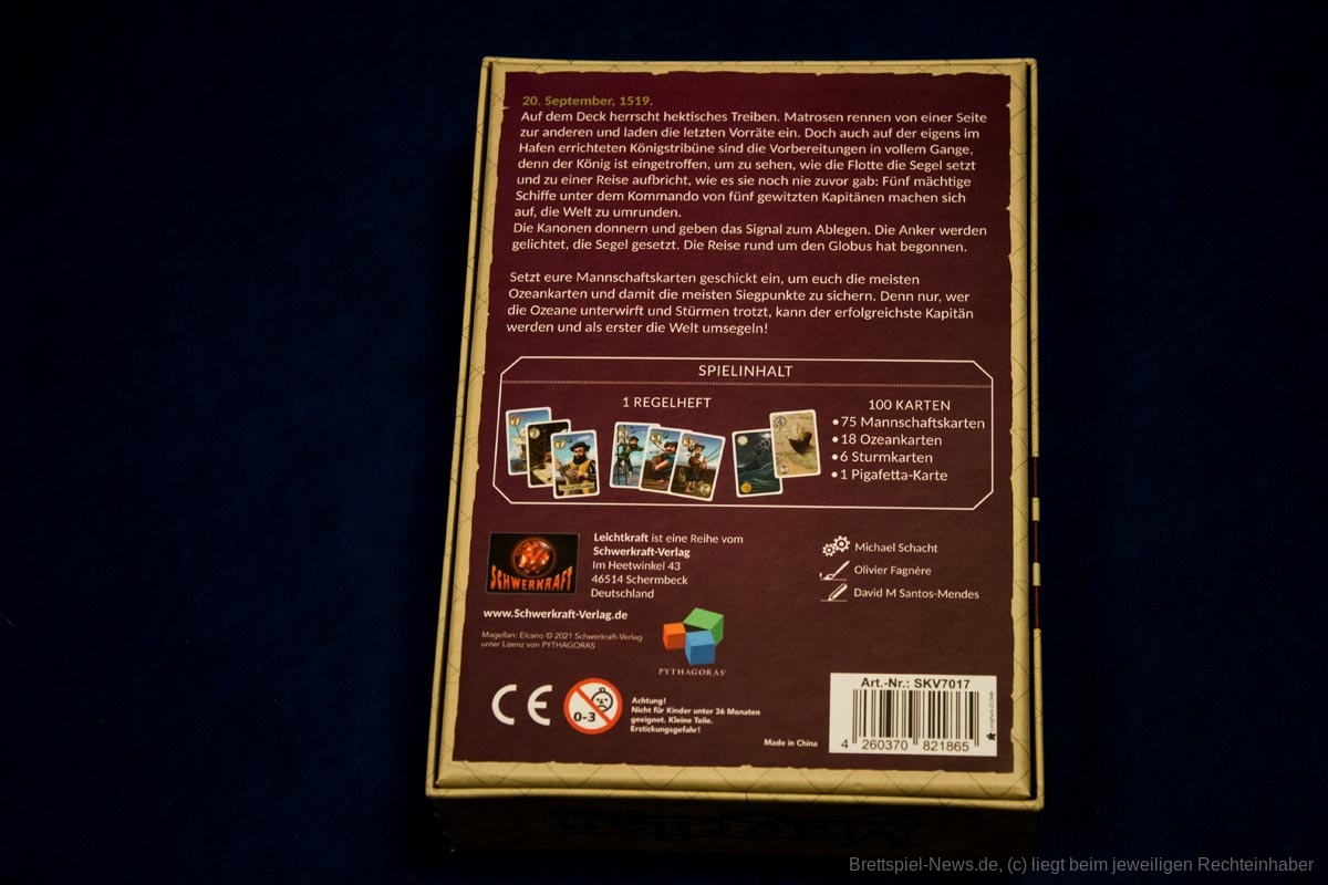 „Magellan“ ist ein Karten basiertes Biet-Spiel auf Familienspiel-Niveau, das in einer kompakten Spielschachtel verstaut ist, die allerdings immer noch zu 50% mit Luft gefüllt ist. Das Titelbild ist stimmig, passt aber nicht so recht zum restlichen Spielmaterial, das in buntem Comic Stil illustriert wurde. Beide Stile gefallen uns, passen nur nicht wirklich zusammen.
