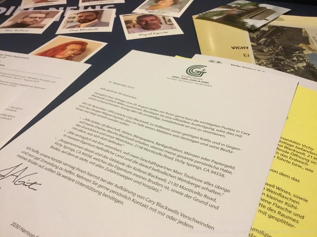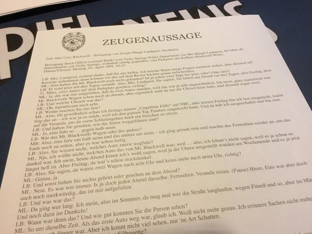 Auch qualitativ ist das gesamte Material so prickelnd wie ein tödlicher Cocktail aus Schlaftabletten. Alles läuft über Zettel. Gesprächsprotokolle gibt es nur nachträglich von einer Tonbandaufzeichnung abgetippt. Hier wäre eine tatsächliche Tonaufzeichnung ein Lichtblick gewesen. Doch verschenktes Potenzial findet sich in der überzogen großen Schachtel an jeder Ecke. Die Unterlagen wirken billig mit schnell hingeklatschten Behördenwappen. Die Gestaltung der Texte ist monoton. Personenfotos sind bedruckte Pappkarten, statt authentischer Fotos, wie in Ermittlungsspielen anderer Verlage. Besonderes Spielmaterial suchen die Ermittlerinnen und Ermittler ebenfalls vergebens. Davon liegen nur Fotos bei. Das allerschlimmste sind jedoch die lausig bearbeiteten Fotos des Ermordeten. Bei allen anderen Personen wurden einfach Datenbankfotos verwendet und diese wirken durch Schattenwürfe glaubhaft. Der Kopf des Opfers wurde leider immer von links, der restliche Körper von rechts beleuchtet. Das Resultat ist mehr als peinlich und offensichtlich unecht. Dadurch wirkt der gesamte Fall lächerlich. Ein Mord an meinen Sehnerven.
