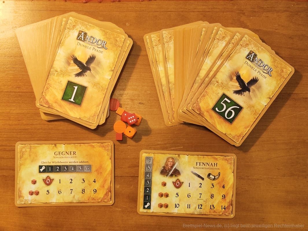 Es gibt teilweise sehr viel Text zu lesen, der über mehrere Karten geht. Was nicht per se schlecht ist, aber das Verhältnis von Text zu einem individuellen Verlauf der Geschichte passt dadurch nicht ganz. Auch passiert im ersten Teil neben dem Erkunden des Gebiets relativ wenig. Bei unserem Durchlauf stießen wir hier nur einmal auf Gegner und mussten eine Stärkeproben ablegen. Was beides keinerlei Probleme darstellte und schnell abgehandelt war.