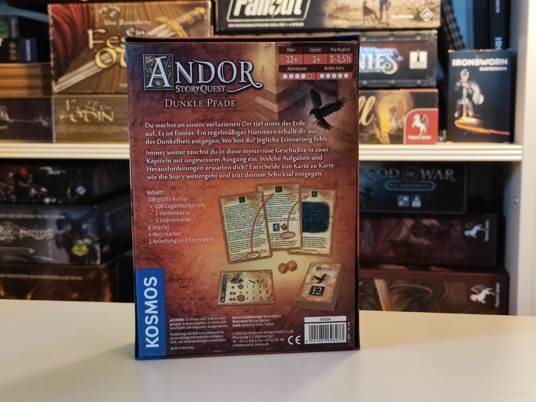 „Andor Story Quest - Dunkle Pfade“ ist eigentlich ein Abenteuerspielbuch, wie ich es von früher kenne, nur in Kartenform und mit etwas mehr Interaktion. Und es macht mir die Bewertung nicht leicht, um nicht zu sagen: echt schwer… Ich mag die Welt von Andor und finde auch hier das Design der Karten, welches sofort dazu führt, dass ich mich ‚heimisch‘ fühle, sehr schön. Der Anfang der Geschichte verspricht Spannung und hat direkt den Wunsch geweckt, wieder in diese Welt einzutauchen.