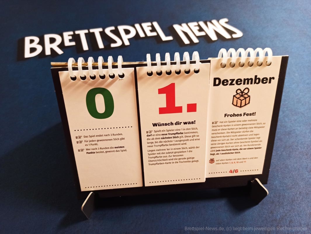 Beim Zusammenbau des Kalenders, bei dem etliche kleine Kreise ausgepöppelt werden wollen, was aber mit den beiliegenden Klammern dann doch einigermaßen flott von der Hand geht, weckt das Spielmaterial auf jeden Fall die Neugierde. Nach getaner Arbeit sehen wir uns einem täuschend echt wirkendem Tischkalender gegenüber. Damit wird der eher ernüchternde Ersteindruck zum Glück wieder ausgeglichen.