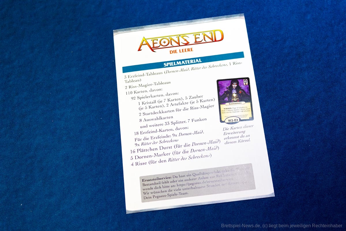 In „Aeons End – Die Leere“ bleiben die Grundregeln unverändert, nur ein neuer Effekt „Verknüpfbar“, den vier der fünf neuen Zauber haben, kommt hinzu. Durch diesen Effekt können zwei Zauber an einen Riss gelegt werden anstatt wie sonst üblich nur ein Zauber. Dabei müssen beide Zauber über diese Fähigkeit verfügen. Die weiteren neuen Karten für die allgemeine Auslage beinhalten zwei Artefakte sowie einen Kristall. Außerdem kommen der Rissmagier Xaxos, die Rissmagierin Sparrow und ihre Widersacher, jeweils mit der Schwierigkeitsstufe vier, der Ritter des Schreckens und die Dornen-Maid dazu. Zudem befinden sich 33 Splitter und sieben Funken in der Spielschachtel, wodurch die Decks aller Rissmagier und Rissmagierinnen aus dem Grundspiel der zweiten Welle und dieser Erweiterung fertig zusammengestellt einsortiert werden können.