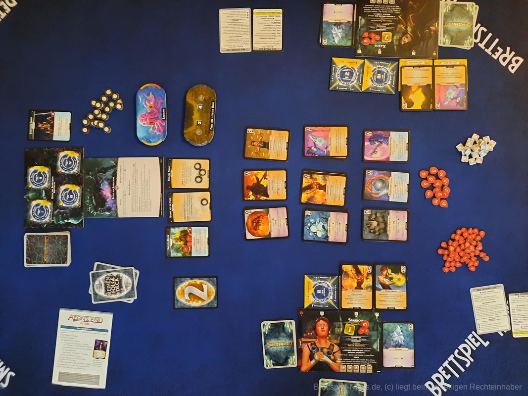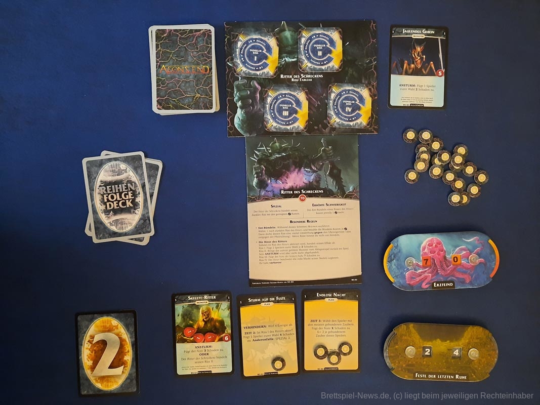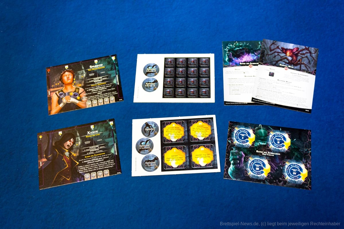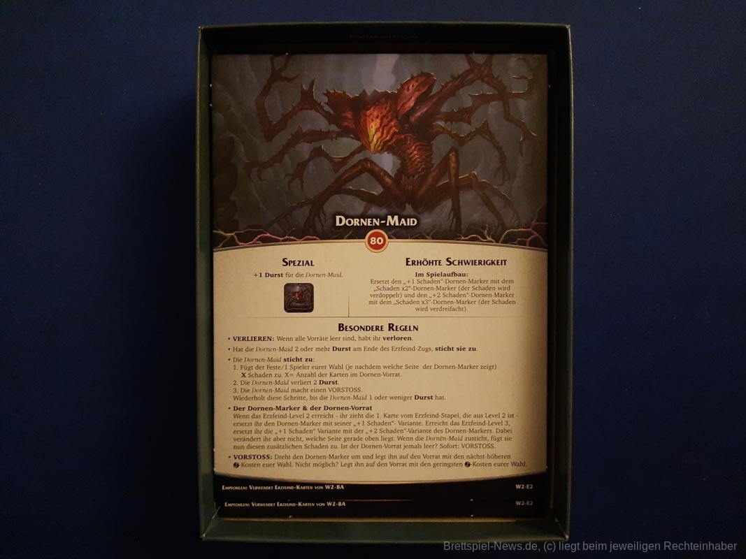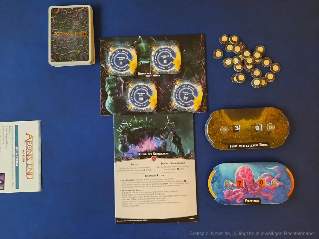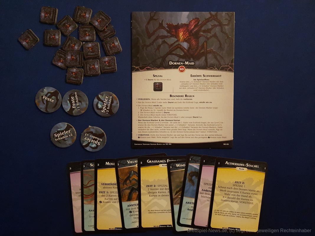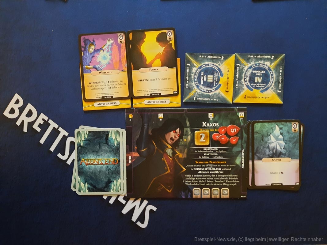 Die Erzfeinde sorgen beide für mehr Abwechslung und liefern spannende Kämpfe, wobei der Schwierigkeitsgrad der Dornen-Maid durch die Wahl der Vorratskarten stark beeinflusst wird. Zudem ist diese etwas Komplexer von der Abhandlung des Erzfeindzuges. Hier wäre eine kurze Anleitung schön gewesen, ebenso wie eine kurze Erläuterung zu den Fähigkeiten der Rissmagier, damit es zu keinem Missverständnis kommt. Diese lassen etwas Spielraum bei der Interpretation zu. Eine Spielanleitung liegt dem Spiel nicht bei, nur eine Auflistung des Spielmaterials sowie eine Zuordnung der Erweiterung und eine Spielempfehlung. Empfohlen wird diese Erweiterung zusammen mit allgemeinen Erzfeindkarten aus dem Grundspiel der zweiten Welle, welches in diesem Test so geschehen ist. Grundsätzlich lassen sich alle Erweiterungen und Grundspiele miteinander kombinieren, jedoch kann dieses den Schwierigkeitsgrad der Erzfeinde beeinflussen. Optisch und thematisch fügt sich die Erweiterung nahtlos in das Universum von Aeon’s End ein, wobei durch das erneute Auftauchen von Xaxos dessen Geschichte etwas weitererzählt wird.