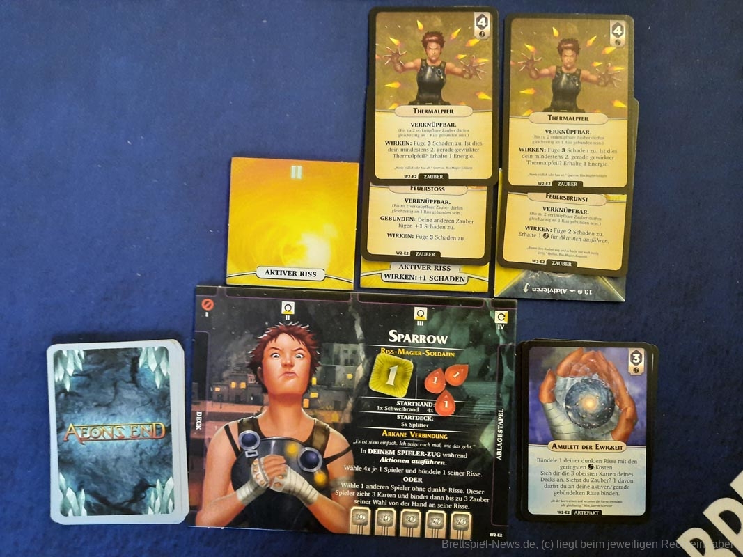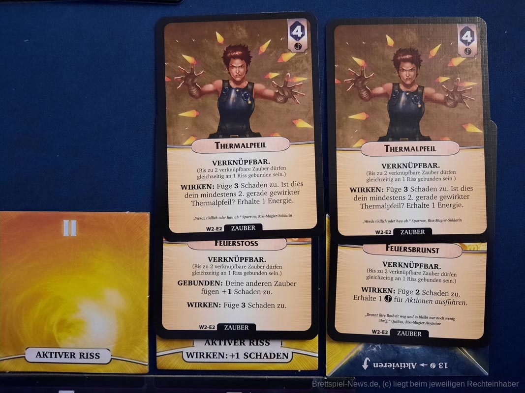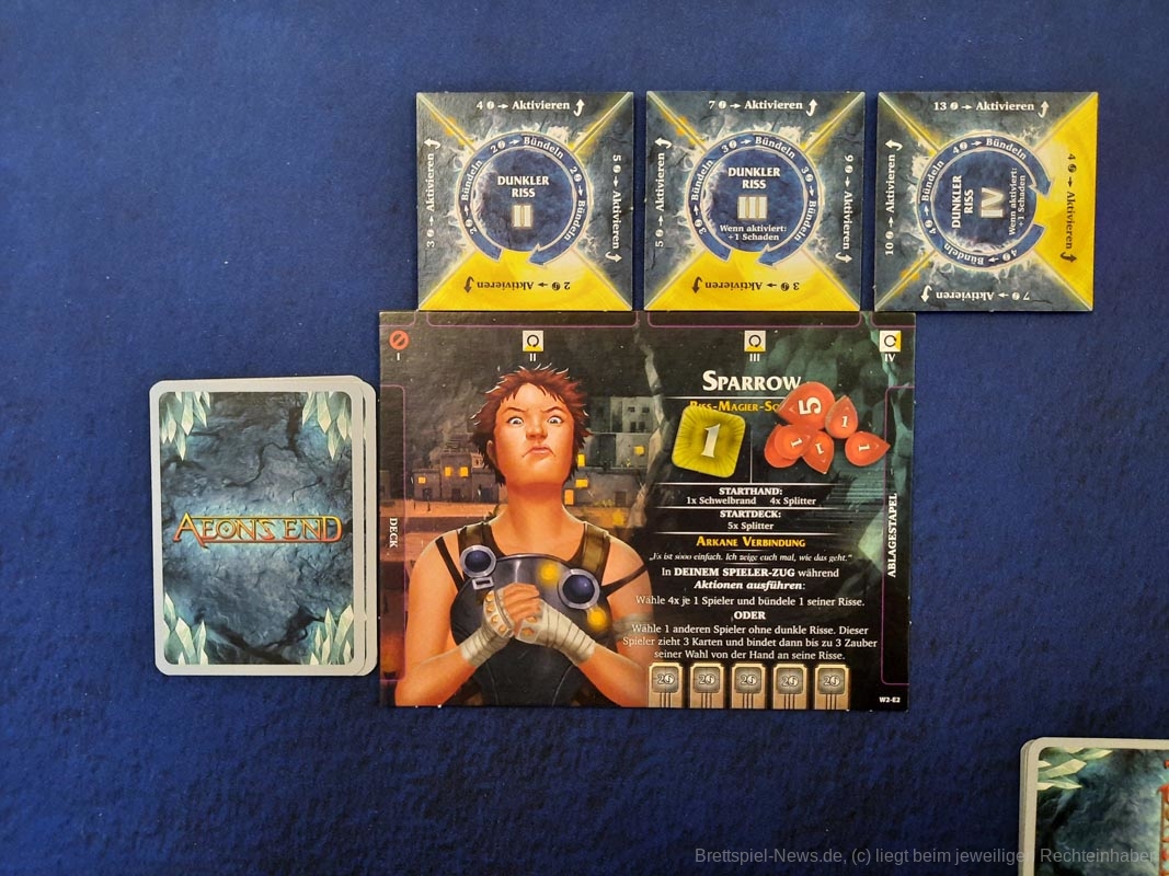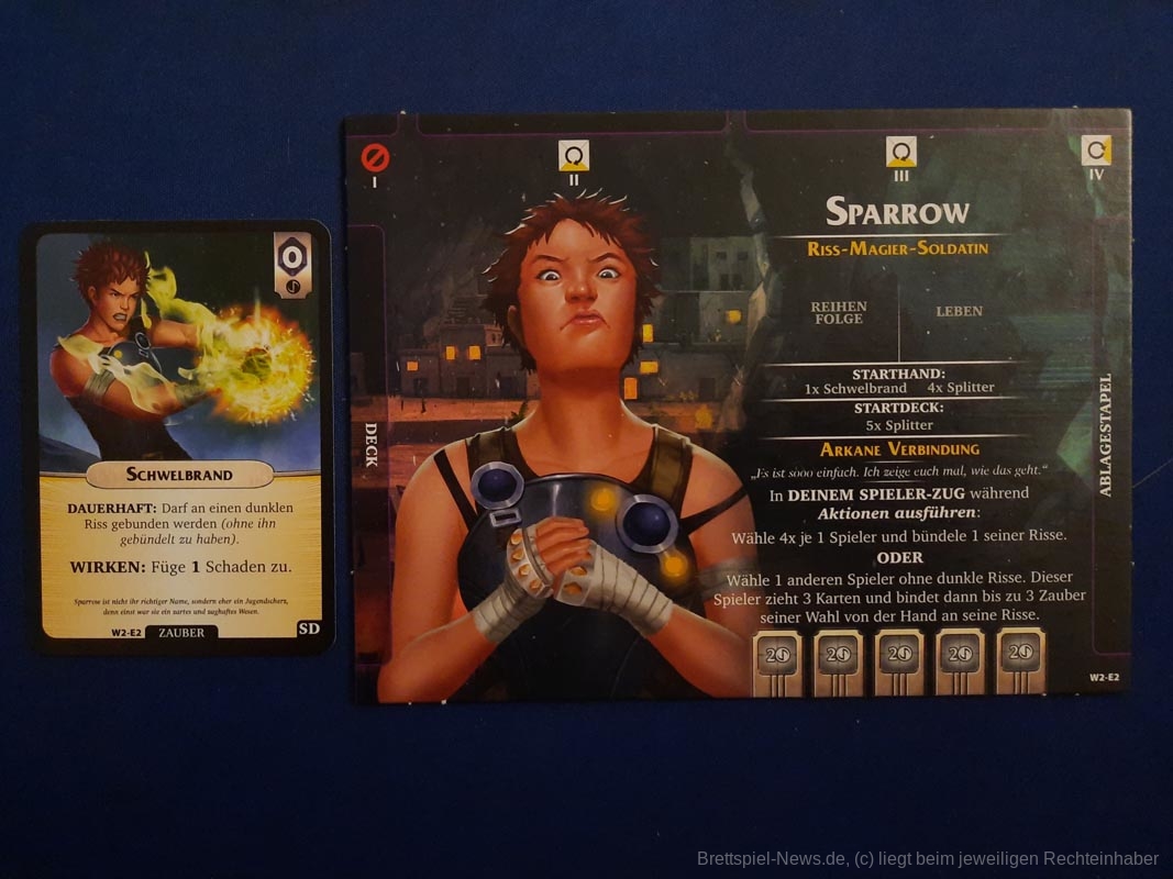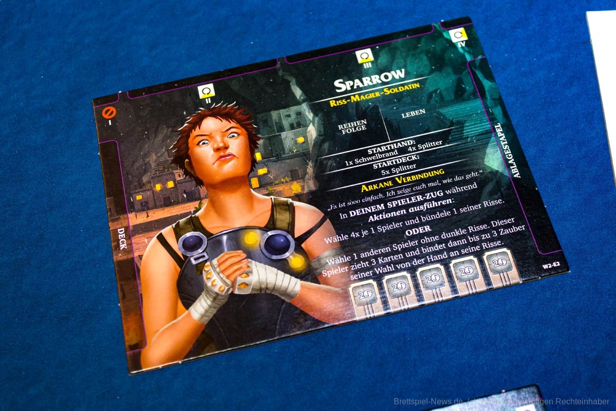 Die Rissmagiern Sparrow startet mit drei dunklen Rissen, neun Splittern und der persönlichen Startkarte. Für fünf Energie kann sie entweder vier Mal einen Riss bündeln, dies darf in beliebiger Kombination bei allen mitspielenden Personen erfolgen, oder sie kann eine andere Person (außer sich selbst) drei Karten ziehen lassen, welche dann zusätzlich bis zu drei Zauber aus der Hand an die Risse legen darf. Der Rissmagier Xaxos startet mit einem gebunden sowie drei dunklen Rissen, acht Splittern, einem Funken sowie der persönlichen Startkarte. Für vier Energie darf er eine andere Person wählen, die eine Energie erhält und dafür eine zufällige Karte von der Hand abwirft. Dann darf Xaxos einen seiner Risse bündeln, ein Leben heilen und eine Karte auf der Hand oder in dem eigenen Ablagestapel zerstören.