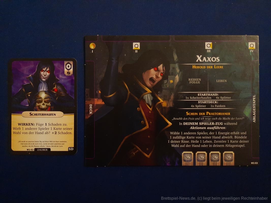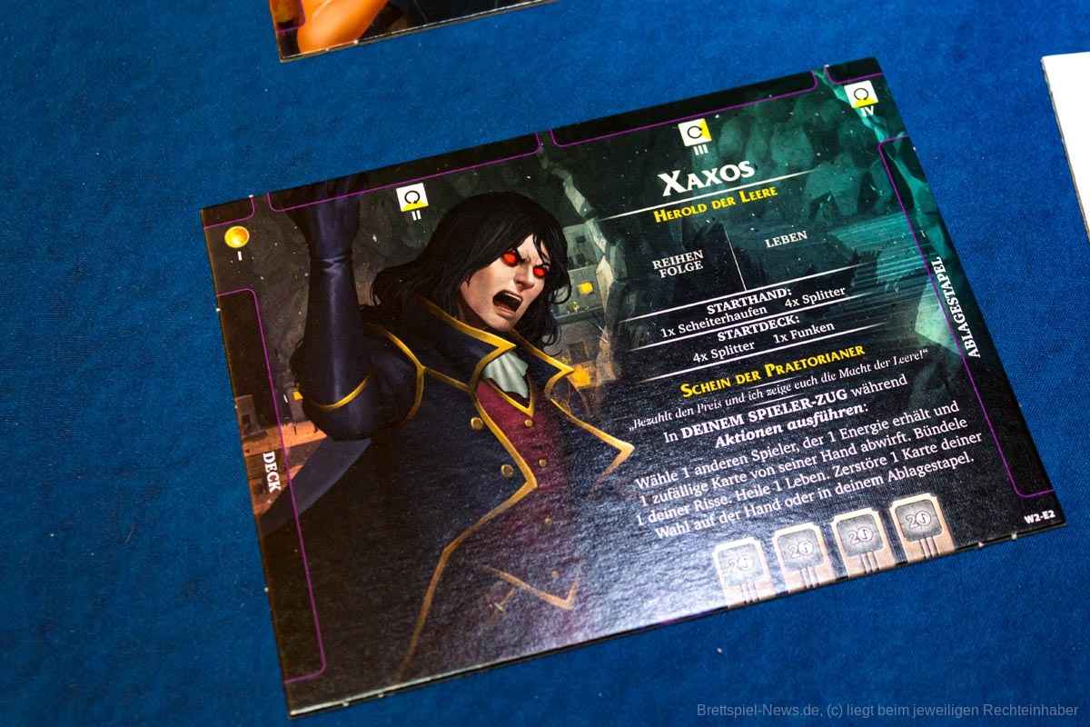 Dabei profitieren Rissmagier und Rissmagierinnen mit weniger verfügbaren Rissen mehr von dieser Möglichkeit. Hierdurch kann sich die Schwierigkeit der Erzfeinde erhöhen beziehungsweise reduzieren. Dies stellt jedoch kein Problem dar, denn es gibt genug Möglichkeiten in den Grundregeln die Schwierigkeit zu modifizieren, damit ein spannender, aber gewinnbarer Kampf entsteht. Die Rissmagier passen sich gut in die Reihe der anderen Rissmagier ein, wobei mir Sparrow besser gefallen hat. Durch die Auswahlmöglichkeit bekommt sie eine zusätzliche taktische Komponente. Einerseits ist es gut, wenn die mitspielenden Personen die eigenen Risse nicht bündeln, damit diese kosteneffizient gebündelt werden können. Soll die andere Option gewählt werden, müssen die Risse bei einer anderen Person alle gebündelt sein, damit diese drei Karten zieht. Neben Sparrow taucht Xaxos wieder auf. Fans von Aeon’s End mag dieser aus dem Grundspiel der ersten Welle bekannt sein, doch trägt er nun den Beinamen Herold der Leere und beherrscht die Blutmagie. Durch diese Fähigkeit kann er seine Energie einbringen um eine Reihe von Effekten auszulösen, wovon gerade das Heilen um einen Lebenspunkt Gold wert sein kann. Nachteilig bei ihm sind jedoch auch die vielen Effekte, die nicht immer alle gewünscht sind, zumindest nicht bei den anderen rissmagischen Personen.