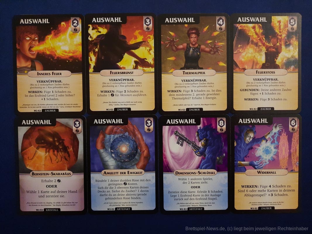 „Aeons End – Die Leere“ ist eine Erweiterung der zweiten Welle, die in erster Linie mehr Abwechslung mit sich bringt. Bei den Zaubern kommt zudem der neue Effekt „Verknüpfbar“ hinzu, welcher es ermöglicht zwei Zauber mit dieser Fähigkeit an einen Riss anzulegen. Hierdurch bietet sich eine neue strategische Komponente, bei der mit weniger gebündelten Rissen gespielt werden kann. Damit dieses jedoch gut funktioniert, sollten mindestens zwei eher sogar drei Zauber mit dieser Fähigkeit für den allgemeinen Vorrat gewählt werden. Folglich kann dies dazu führen, dass die Variation bei den Zaubern in der Auslage für die nächsten Partien abnimmt. Wer möchte nicht acht Zauber bündeln um dem Erzfeind mal richtig Feuer unter dem Allerwertesten zu machen?