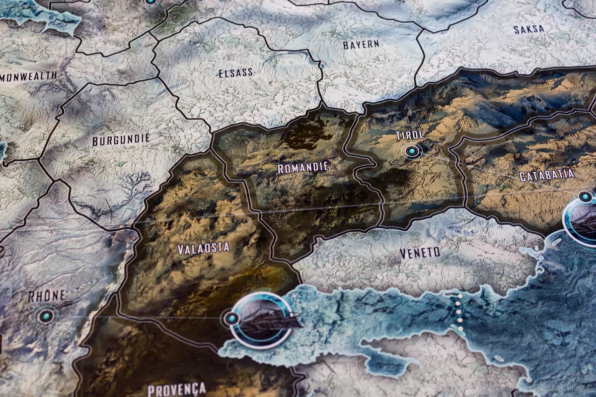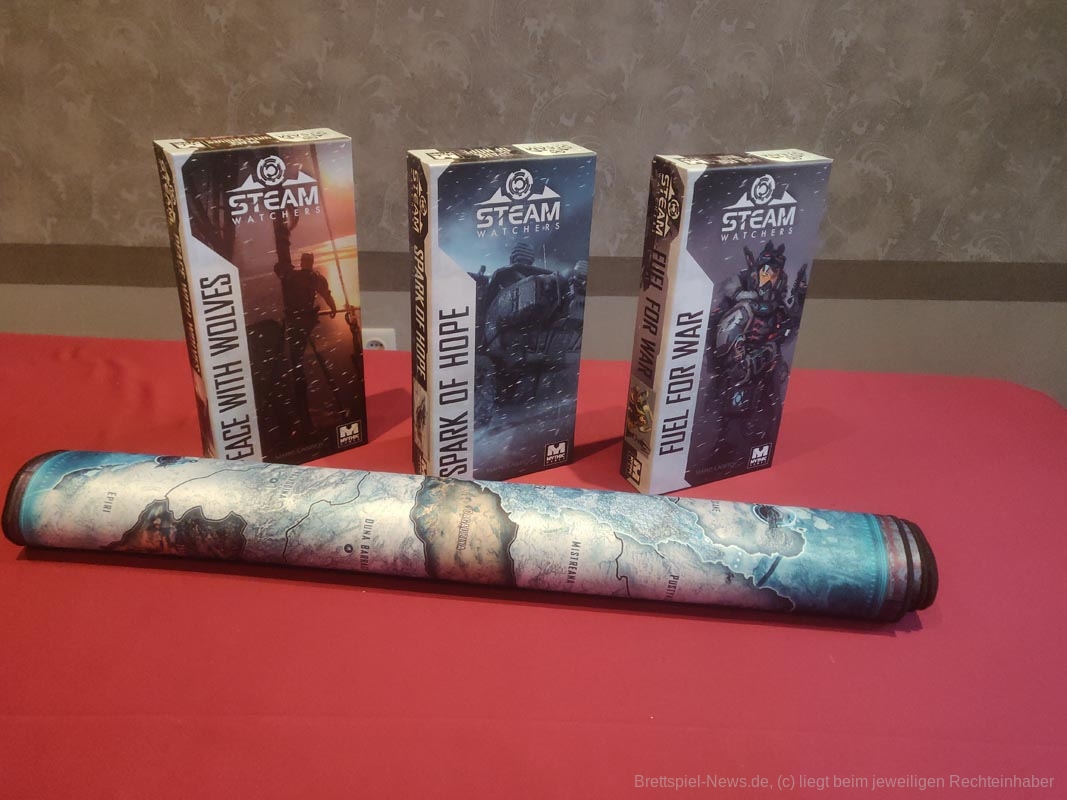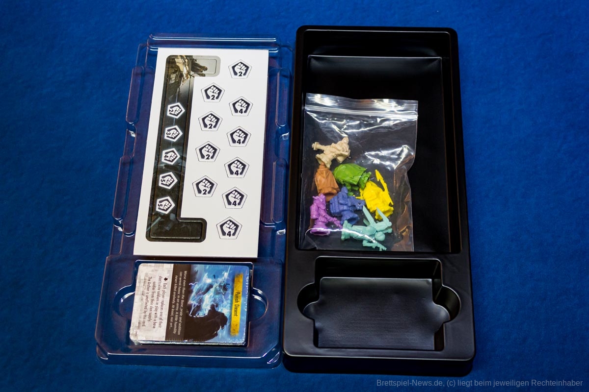 Auch bei der Spielmatte bin ich zwiegespalten. Auf der einen Seite sieht sie sehr schön aus und macht auch einen sehr wertigen Eindruck, aber auf der anderen Seite ist sie mit ihrem Meter Länge einfach extrem groß. Durch sie wird das Spiel von einem großen zu einem gigantischen Spiel, das kaum auf einen normalen Tisch passen dürfte. Eine Möglichkeit die Spielmatte unterzubringen, gibt es auch nicht. In die Spielschachtel passt sie aufgrund ihrer Ausmaße nicht.