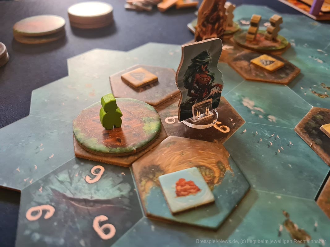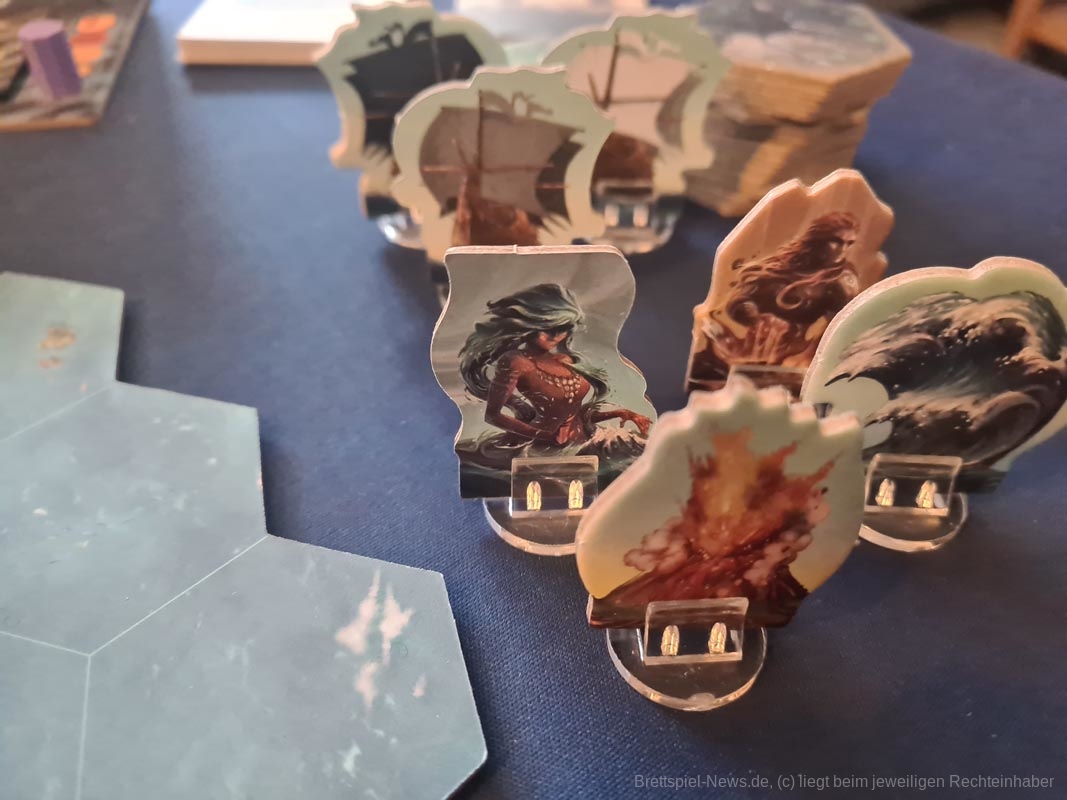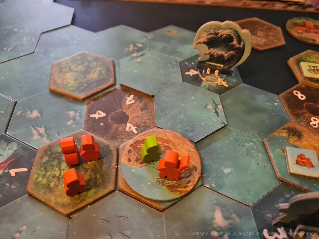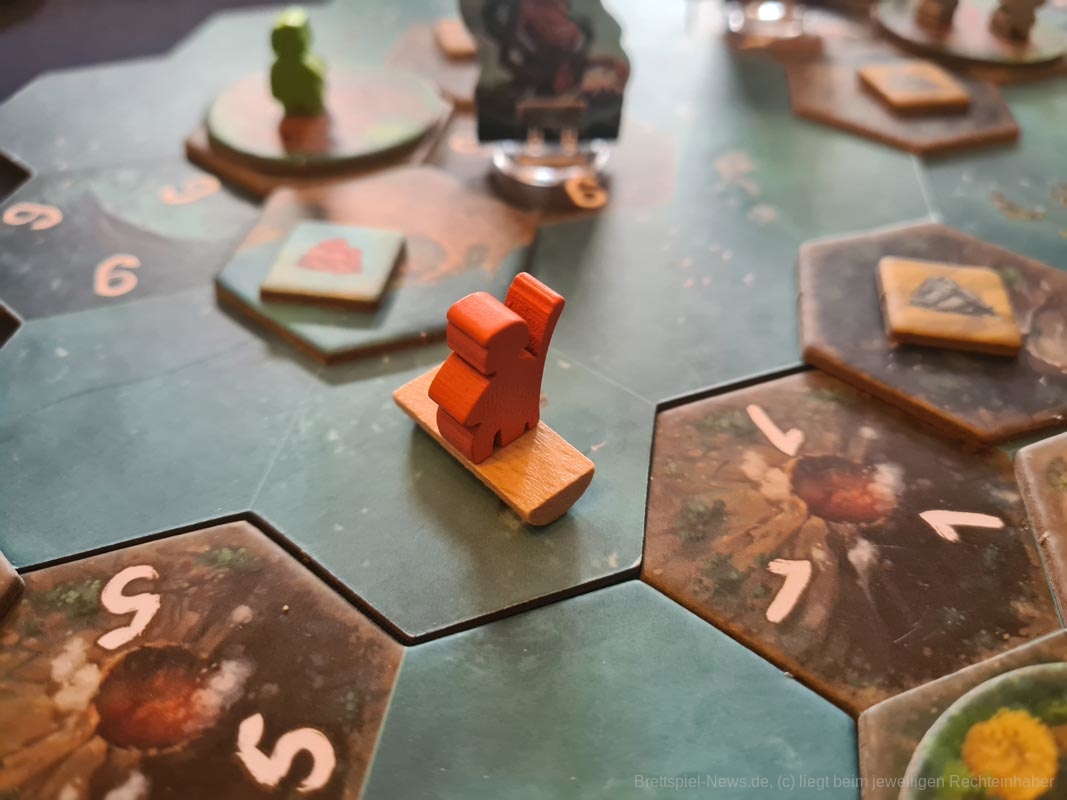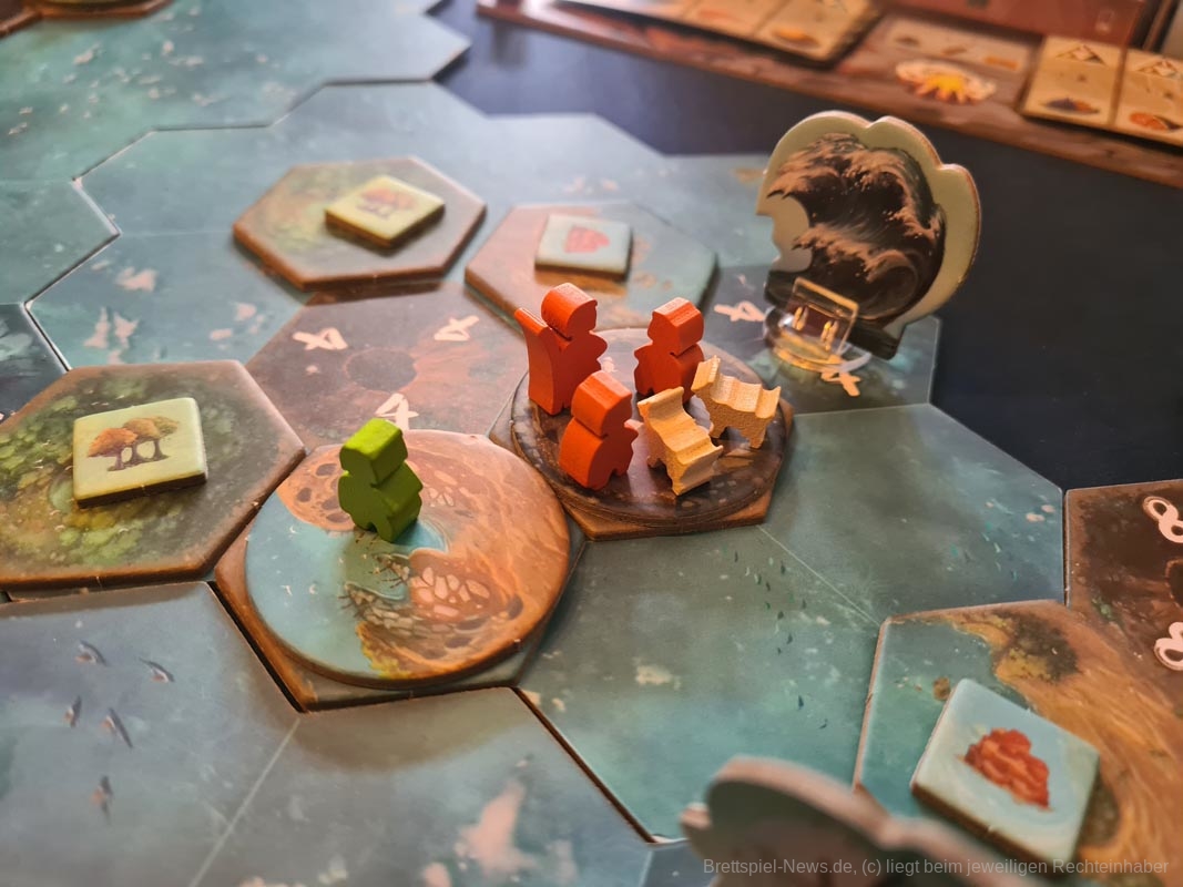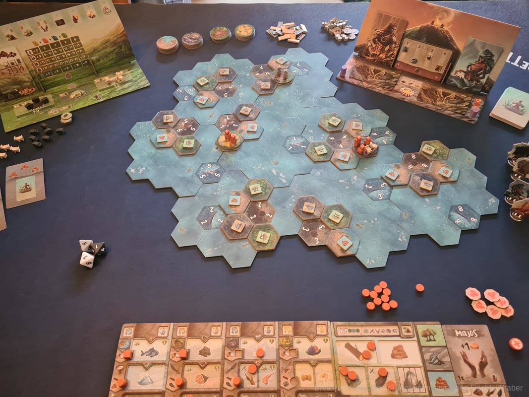In diesem Bezug ist „Tindaya“ sehr brutal. Oh, du hast grade eine schöne neue Siedlung mit ganz vielen Meeplen aufgebaut? Zu blöd, dass die ganze Insel am Ende des Zuges verschwinden wird und du mal eben ganz fix alles evakuieren solltest. Oh, daneben ist ein Vulkanausbruch, der alles andere mit sich nimmt? Tja, dann mal in der nächsten Runde mehr Glück.