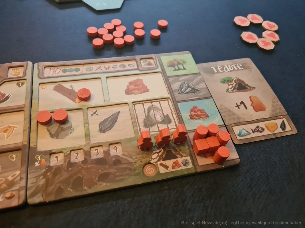 „Tindaya“ ist nämlich viel komplexer, als es den Anschein hat. Jede Aktion hat Folgen sowie mehrere Faktoren und Regeln, die berücksichtigt werden müssen. Um nicht alle Regeln auf einmal auf dem Tisch zu haben, bietet „Tindaya“ an, dass das Spiel in vier Proberunden immer mehr Regeln etabliert - was schon einiges über die Komplexität des Spiels aussagt. Besonders hilfreich empfand ich beim Lernen der Regeln die Symbole und viele Abläufe, die auf simpler Logik basieren. Wenn ich X gemacht habe, wusste ich, dass Y folgen musste, weil es in der Realität ähnlich ist. Wenn ich zum Beispiel zwei Meeple auf dem Feld hatte, wusste ich, dass ich am Ende der Runde 3 Meeple dort haben werde, die ich auch mit Essen versorgen muss (Reproduktion und so).