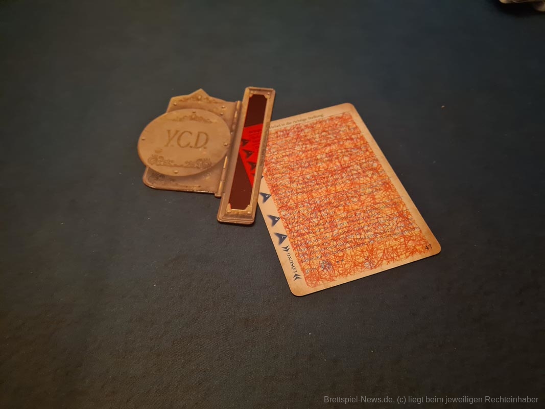 Aktiv waren in dieser Zeit jedoch nur drei Personen. Größter Knackpunkt war die Präsentation der Rätsel. Wird nämlich ein neues Rätsel aufgedeckt, muss zunächst ein halber Roman an Text vorgelesen werden. So besteht ein Rätsel in vielen Fällen auch nicht aus nur einer, sondern gleich aus mehreren Karten, die alle vorgelesen werden müssen. Die vorlesende Person ist damit zwar im Besitz aller Informationen, anderen könnte es aber schwer fallen, diese Fülle an Informationen auf diese Art und Weise zu verarbeiten. Während also eine Person bei uns vorlas, wurden die Rätselkarten herumgereicht, damit der gesamte Text noch einmal persönlich gelesen werden konnte, was dazu führte, dass die anderen Personen die Rätsel in der Zwischenzeit bereits gelöst hatten. So konnten sich nicht alle Personen meiner Spielgruppe an der Lösung beteiligen und klinkten sich geistig relativ schnell aus. Die immense Menge an Text ist auch für die lange Spielzeit verantwortlich. Während die Rätsel in vielen Fällen schnell zu lösen sind, benötigt es einiges an Zeit, die Rätseltexte zu lesen und diese überhaupt zu verstehen.