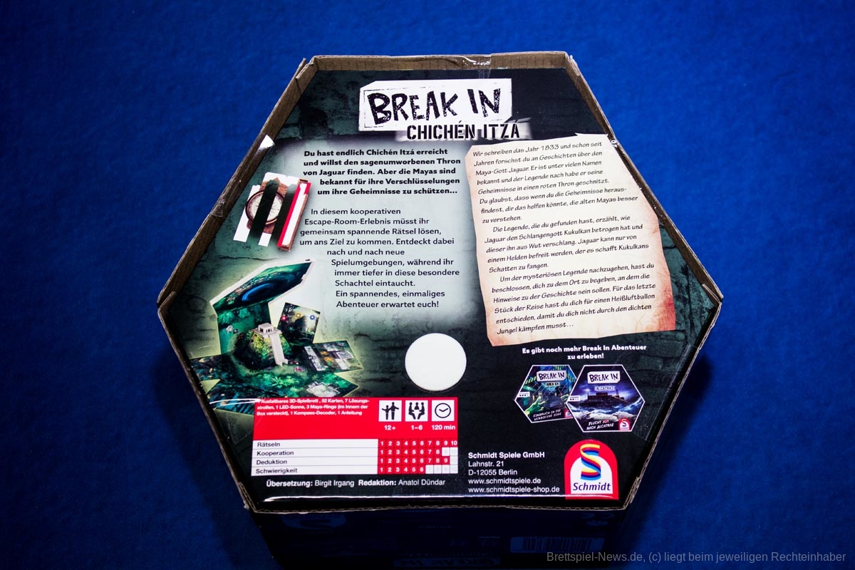 „Break In – Chichén Itzá“ hat meine Spielgruppe etwas gespalten zurückgelassen. Da dies der erste Teil der „Break In-Reihe“ war, der es auf meinen Tisch geschafft hat, waren wir zunächst von der Idee, ein- anstatt auszubrechen, sehr angetan. Das ganze System funktioniert bis auf wenige Ausnahmen auch sehr gut. Es kommt beim Spielen Abenteuerlust auf, da die Spielgruppe immer tiefer vordringt und immer neue Ebenen entdeckt, die das Rätsel weiter lüften. Was dem Spiel jedoch weniger gelingt, ist die Heranführung an die Rätsel von allen Personen einer Spielgruppe. Das lässt sich leicht erklären. Da die maximale Personenzahl sechs beträgt, habe ich das Spiel mit genau dieser Gruppengröße ausprobiert.