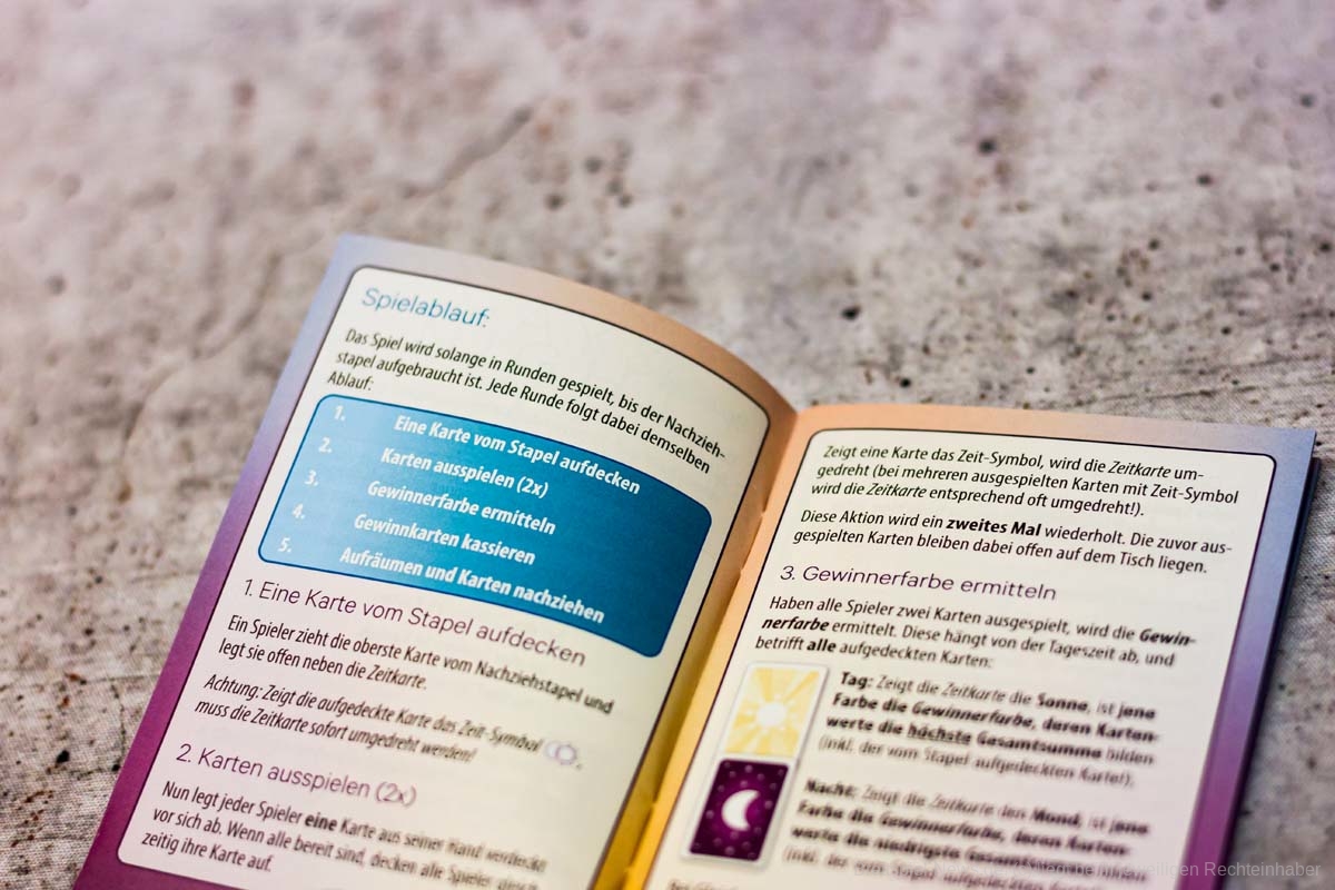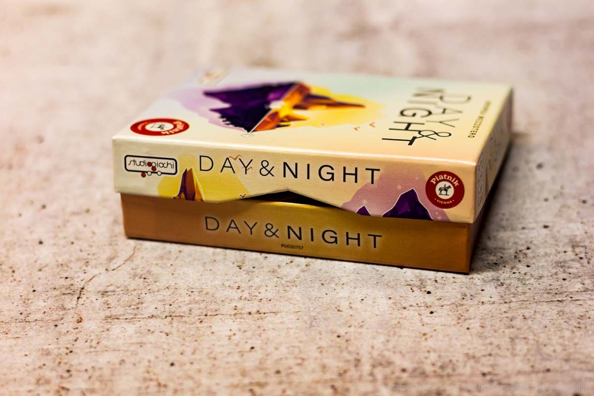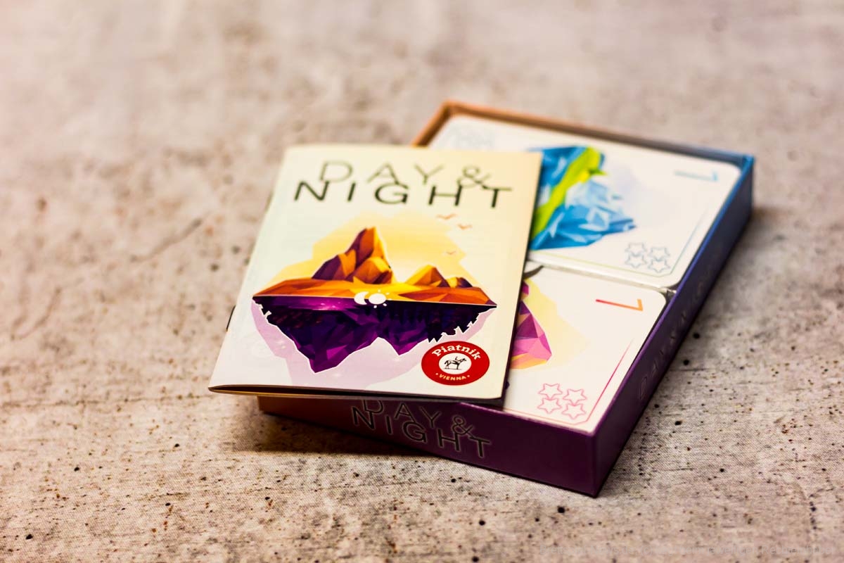 Der Einstieg in „Day & Night“ fällt durchaus positiv auf. Die Optik ist mit den recht einfachen Illustrationen und eher dezenten Farben ansprechend. Die Anleitung beschreibt auf acht kleinen Seiten die Regeln schnell und leicht verständlich. Erklärt ist das Spiel in wenigen Minuten.