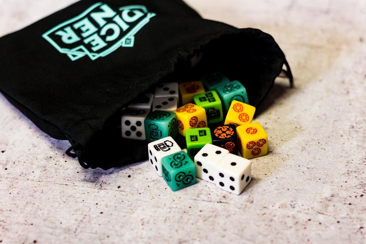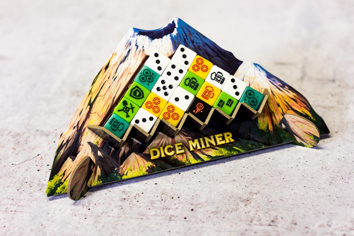 Der offensichtlichste Pluspunkt ist die Tischpräsenz, denn ich kann mich an kaum ein Würfelspiel erinnern, dass so hübsch auf dem Tisch aussieht. Dabei ist der aufgebaute Berg mit Würfeln nicht nur ein optisches Gimmick, sondern tatsächlich sinnhaft für die Spielmechanik, die ich so auch noch nicht gesehen habe. Würfel von einem „Berg“ abbauen und das nur von oben ist zudem auch noch sehr förderlich für das Setting. Dies ist ein weiterer Pluspunkt, denn die Mechanik passt hervorragend zum Thema des Spiels. Auch wenn fünf Würfel mit aufsteigender Reihenfolge mehr als bekannt sind als „große Straße“ aus Yatzy bzw. Kniffel, ist hier die Bedeutung einen Tunnel zu graben der immer ein Anfang und ein Ende hat sinnhaft und zudem deutlich mehr beeinflussbar. Das gilt auch für die Drachen, auf die wir unweigerlich stoßen und die Grubenunfälle, auf die wir uns vorbereiten können.