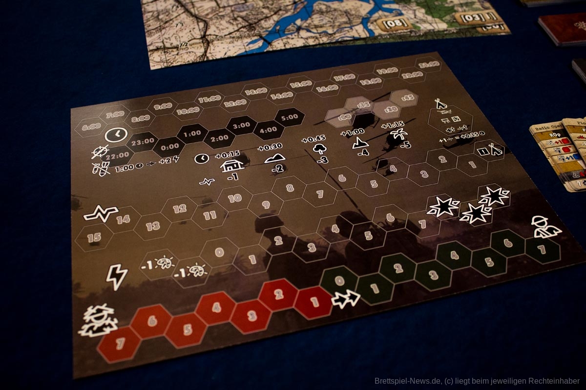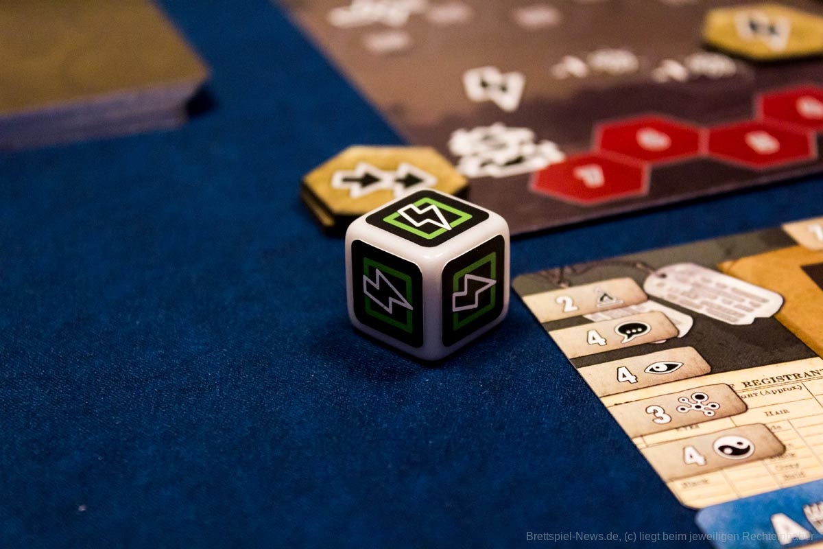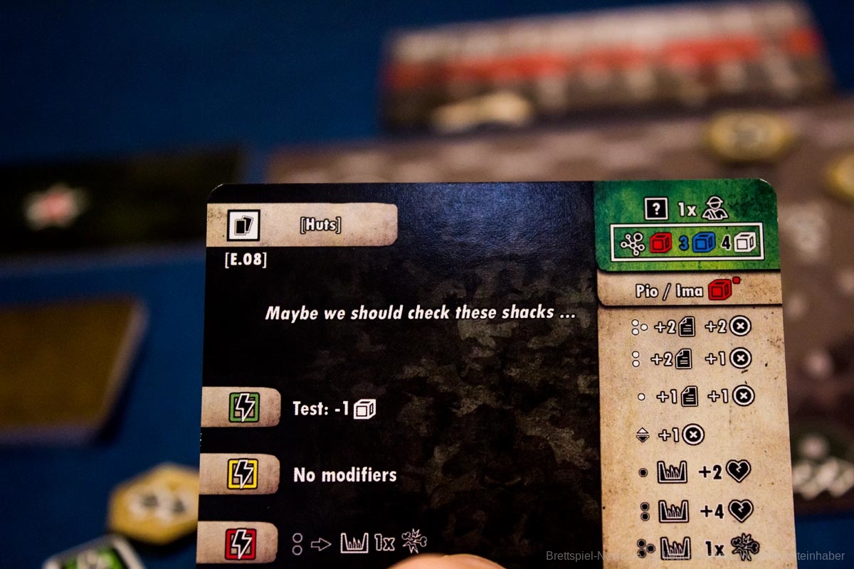 Das führt fließend zum nächsten Punkt: „Purple Haze“ ist eine Art offene Welt, in der uns frei steht wohin wir uns bewegen und alles hängt von unserer Entscheidung, aber auch dem Würfelglück ab. Nehmen wir eine Kräfteraubende zeitintensive Abkürzung oder gehen wir einen Umweg? Gehen wir zu optionalen Zielen oder versuchen gleich unser Hauptziel zu erfüllen? Helfen wir anderen oder kümmern wir uns nur um uns? All diese Fragen sind mit der ordentlich geschriebenen Geschichte, die bisher vielseitig und teilweise überraschend ist, ein motivierendes Konstrukt. Doch das Spiel findet mehr im Kopf statt, auf dem Spielfeld schieben wir lediglich einen Marker und bewältigen den Verwaltungsaufwand. Das ist für mich in Ordnung und „Purple Haze“ hatte genug Motivation erzeugt um dran zu bleiben, was am wichtigsten ist.