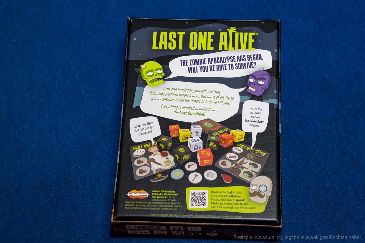 Insgesamt bleibt „Last One Alive“ also ein Würfelspiel, das zwar kurz ist, aber trotzdem irgendwie nicht wirklich knackig laufen will. Das Thema spielt so gut wie keine Rolle und wirkt uninspiriert. Natürlich darf man das einem so kleinen Spiel nicht übermäßig ankreiden, es ist aber ein weiterer kleiner negativer Aspekt. Alle Entscheidungen, die man im Spiel trifft – was zugegebenermaßen nicht wenige für ein solches Spiel sind – wirken belanglos. Es fühlt sich von Beginn an, als wäre es egal, welche Würfel man nutzt. Alles kann super funktionieren oder krachend scheitern. Spaß kommt dabei aber möglicherweise in einer Partyatmosphäre auf, in der man dem Spiel sowieso nur nebenbei Beachtung schenkt. So verschwindet das Spiel auf meinem Spielefriedhof, von dem es wahrscheinlich auch nicht mehr auferstehen wird.
