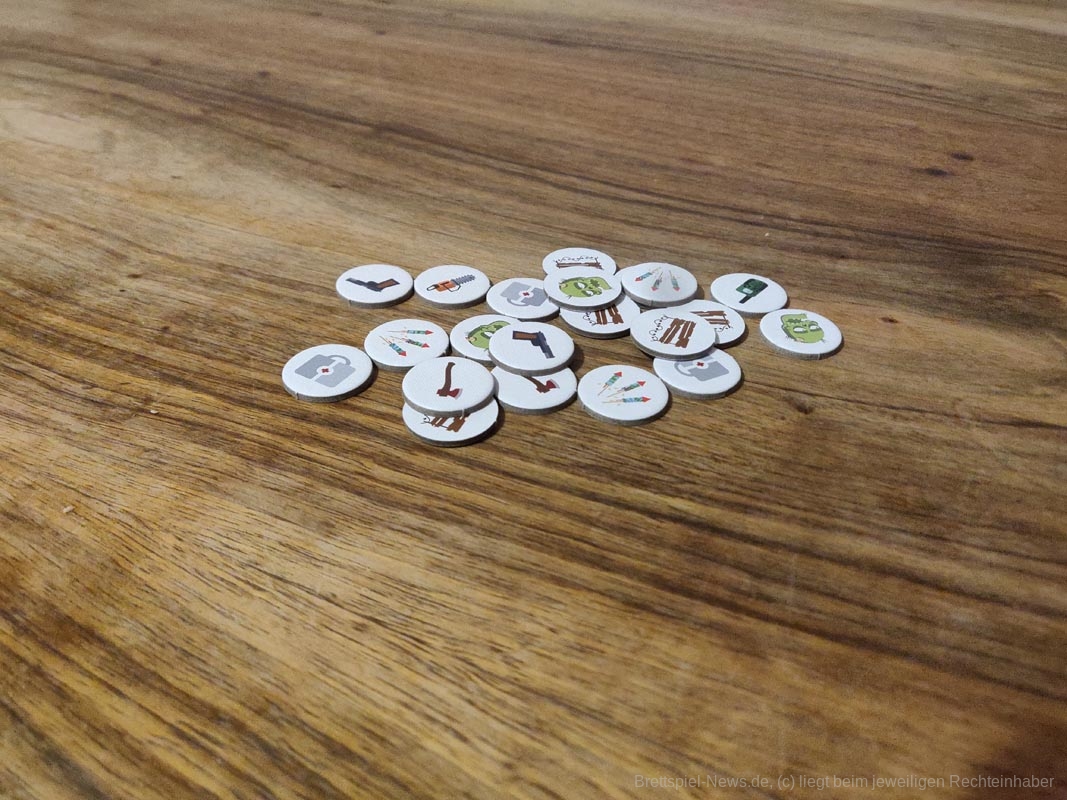 Die Gegenstände, die sich mit den weißen Würfeln ergattern lassen, wirken auf den ersten Blick recht interessant. Diese bieten relativ viele verschiedene Effekte. So lassen sich mit dem Radio extra Karten ziehen oder mit dem Feuerwerk die Zombies zu einer anderen Person verschieben. Außerdem gibt es bei manchen mehrere Optionen, wann sie zum Einsatz kommen können. Allerdings ist es wohl beinah immer ratsam auf die Option zu setzen, die den enormen Glücksfaktor von „Last One Alive“ etwas abmildert. Wer hier einen Hauch von Taktik oder Planbarkeit wittert, ist allerdings auf dem Holzweg. Denn auch die Gegenstände werden zufällig aus einem Säckchen gezogen und manche sind deutlich stärker als andere. So bewahrt einen das Medikit einmalig vor dem Tod, was völlig übertrieben stark ist. Sollte eine Person davon mehrere ziehen, ist das Spiel eigentlich schon entschieden. Als wenn das noch nicht reichen würde an Zufall, sind auch noch Zombie-Apokalypsen-Marker im Säckchen, die die Menge an zu werfenden Zombiewürfeln erhöhen. Es kann also auch sein, dass man gar keinen Gegenstand bekommt, obwohl man den passenden Würfel auf die richtige Seite geworfen hat.