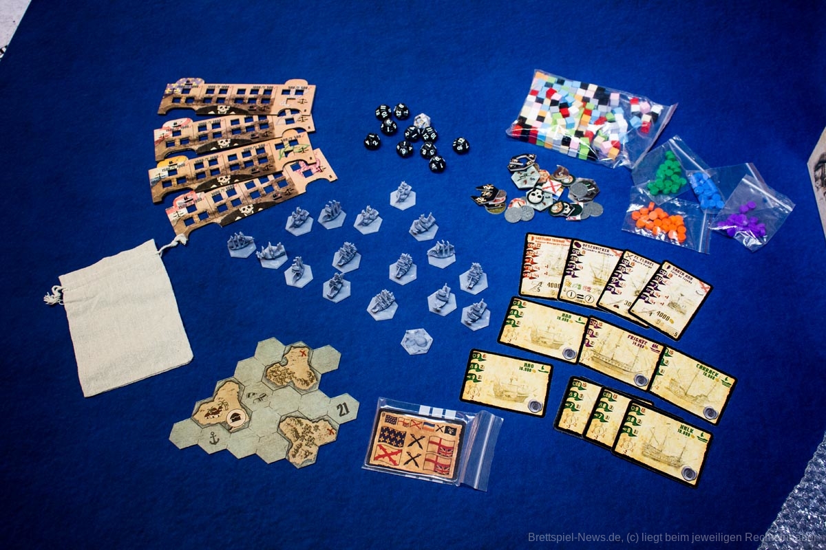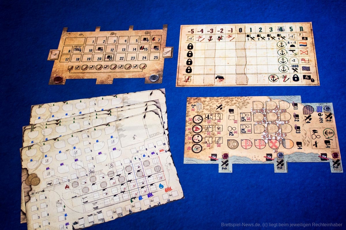 Auch das Gros des Spielmaterials macht es angehenden Kapitänen nicht leichter, da es zwar gut produziert, aber völlig unübersichtlich ist. Da ist beispielsweise das eigene Schiffstableau, auf dem ich immer noch nicht so recht weiß, wohin das L-förmige Teilchen zum Markieren der Schiffsgröße kommt.