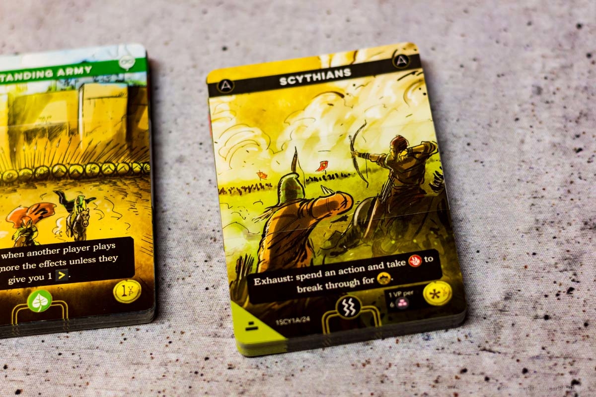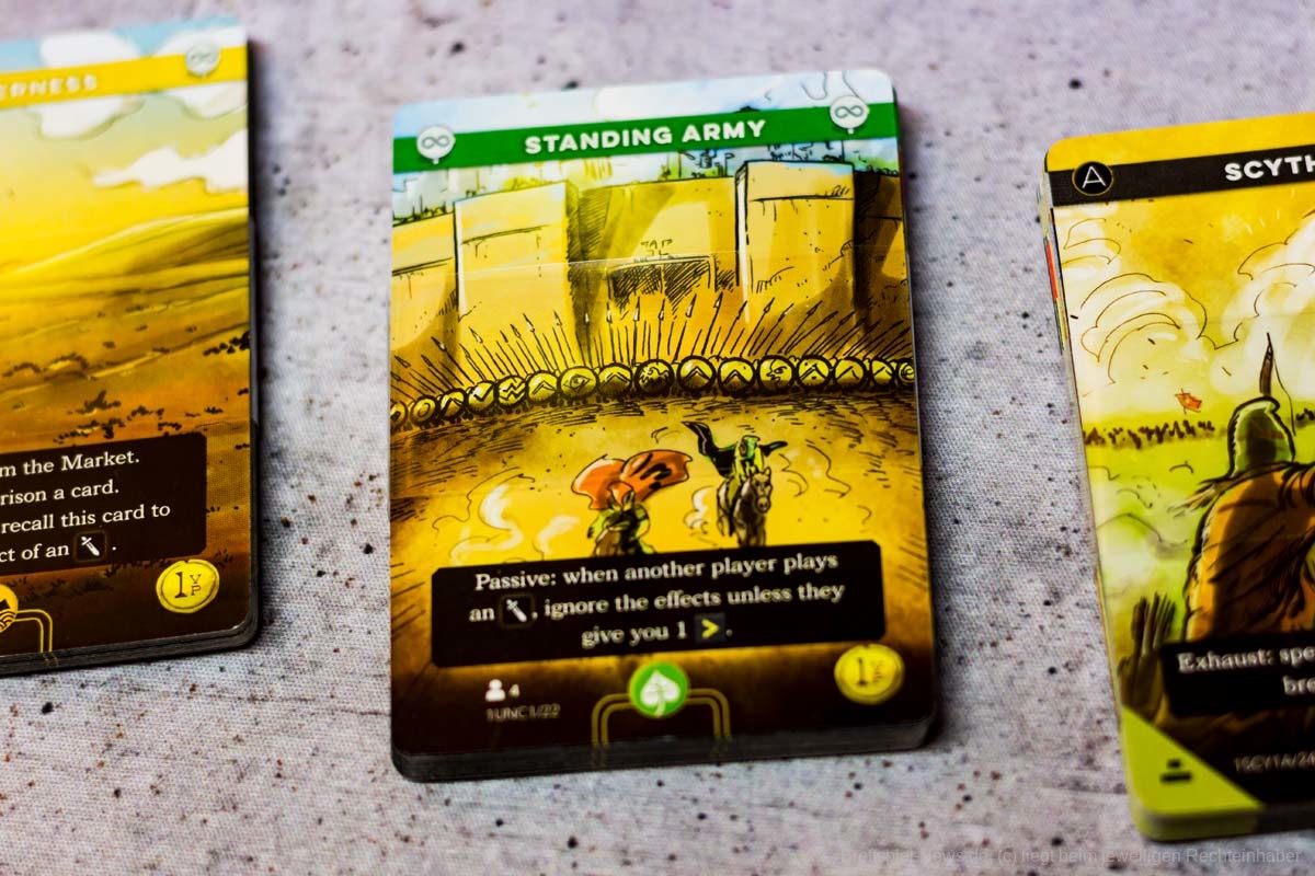 Allerdings gibt es auch Schwächen. Hier ist vor allem die geringe Interaktion anzusprechen. Das Spiel der gegnerischen Seite ist kaum nachzuvollziehen. Der Text der Karten ist klein und auf Entfernung nicht zu lesen. So spielen dann doch alle eher nebeneinander her als miteinander. Es kommt zwar immer wieder vor, dass durch gegnerische Aktionen Karten oder Ressourcen genommen bzw. abgegeben werden, dies fühlt sich aber meist nach eher zufälligen Nebeneffekten an. Da auch die Siegpunkte nur zum Spielende gezählt werden und während des Spiels nicht abschätzbar sind, entsteht auch hier wenig Bezug zu den Mitspielenden.