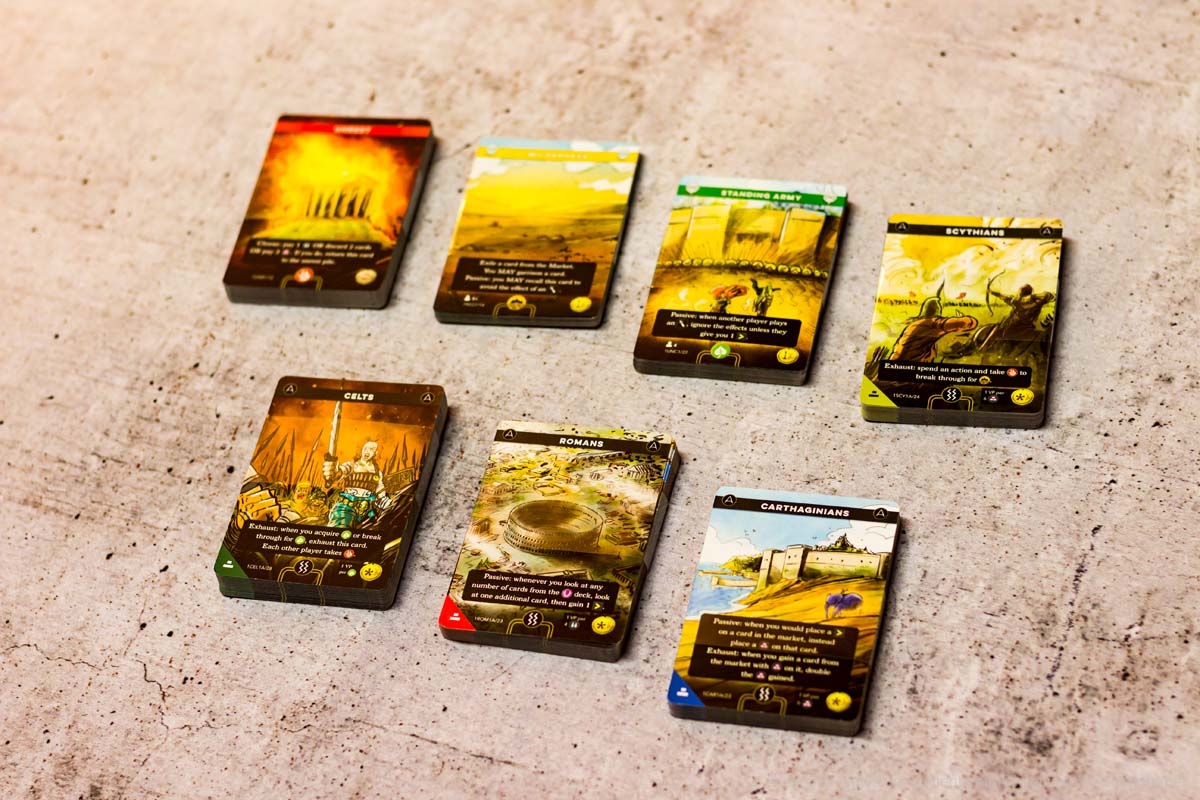 Zur Spielvorbereitung wird in der Spielmitte das Marktspielbrett aufgebaut, an welches oben mehrere Stapel verschiedener Kartentypen ausgelegt werden. Ganz rechts befinden sich die Unruhekarten, die zum Spielende, wenn sie sich im Deck befinden, zwei Minuspunkte einbringen, und das Ruhm-Deck. Letzteres enthält besondere Karten, die schwierig zu erhalten sind, dafür aber starke Aktionen bieten oder viele Siegpunkte wert sind. Von den restlichen Stapeln, die jeweils einen eigenen Kartentyp enthalten, ist stets eine Karte aufgedeckt. Ausnahme ist das Hauptdeck links, das aus verschiedenen Kartentypen besteht und von dem immer zwei Karten offen ausliegen. Unter die meisten offen ausliegenden Karten wird eine der Unruhekarten gelegt.