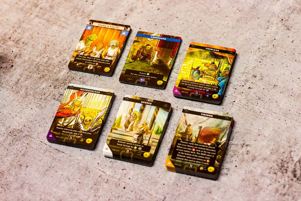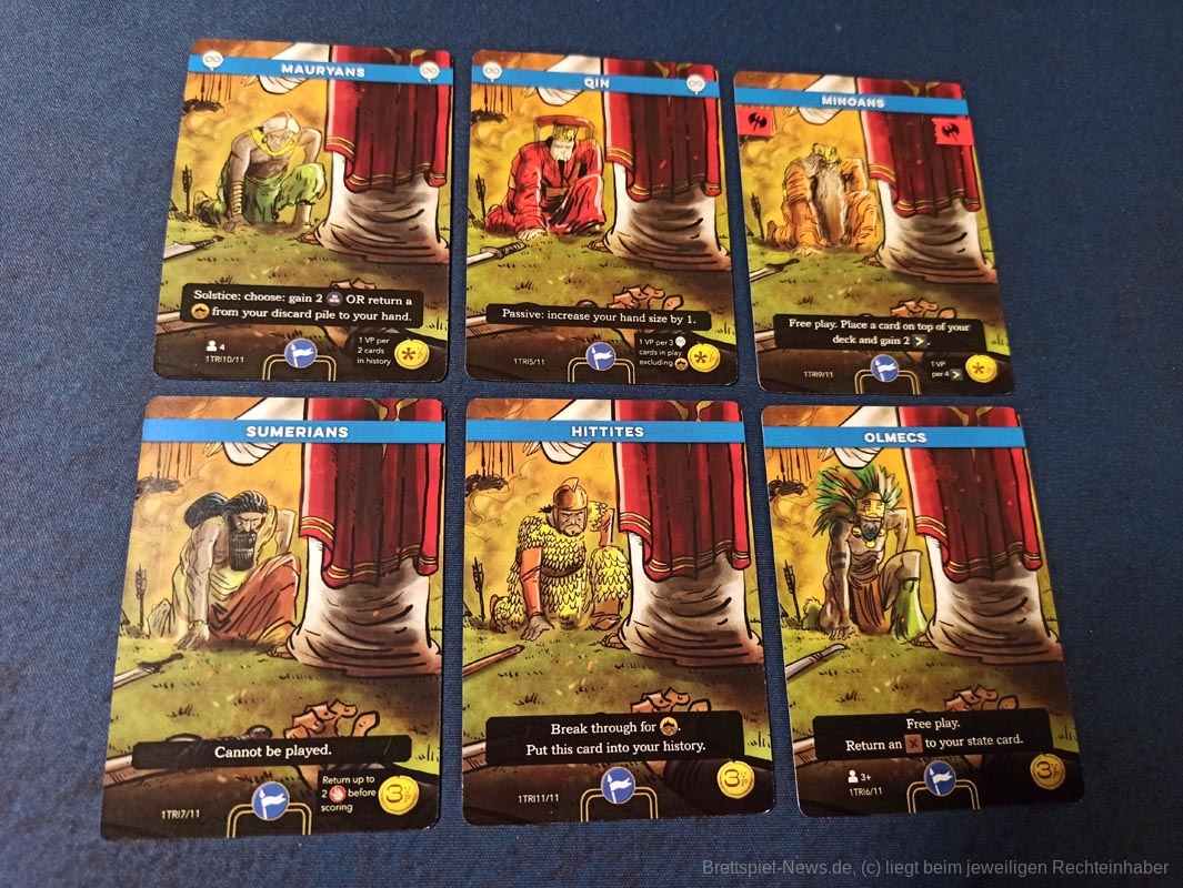 Jede Person wählt eines der acht verfügbaren Völker und nimmt sich das entsprechende Kartenmaterial. Davon wird die Machtkarte ausgelegt, welche eine permanente Fähigkeit und/oder Siegpunktequelle für dieses Volk bietet. Darüber werden die Nationenkarten gelegt, die mit der Zeit in das eigene Deck wandern. Daneben liegen die Entwicklungskarten, die im späteren Spiel freigespielt werden können. Die restlichen Karten werden gemischt und bilden das Startdeck, von dem fünf Handkarten gezogen werden. Eine Karte zeigt an, dass das Volk sich anfangs auf der Entwicklungsstufe von Barbaren befindet, später ist die Entwicklung zum Imperium möglich.