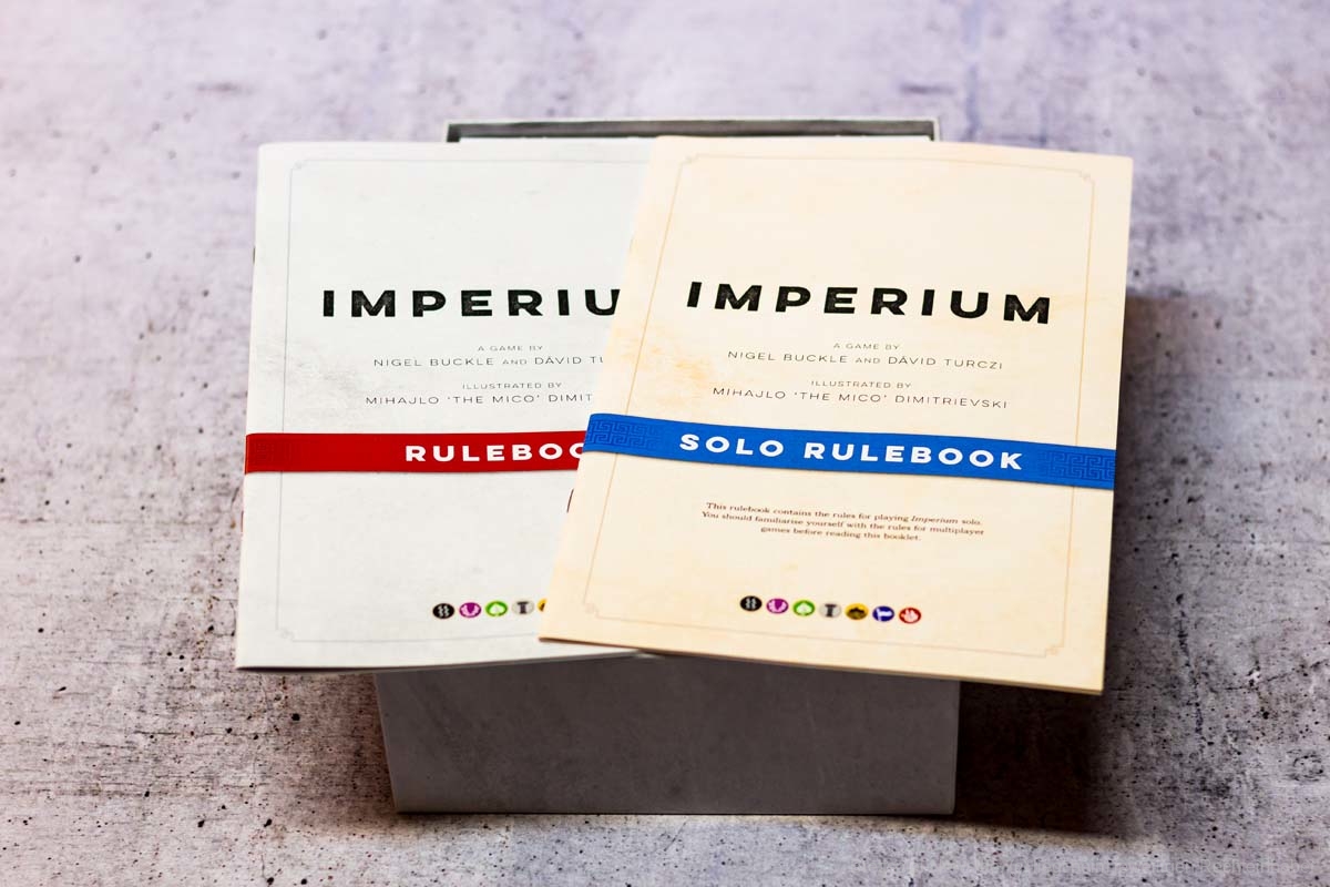 Vor der ersten Partie „Imperium Classics“ steht erst mal die Lektüre der Anleitung, die mit effektiv nur vier Seiten reine Spielregeln überraschend kurz ausfällt. Die restlichen der insgesamt 24 Seiten teilen sich auf in Erklärung der Kartensymbole, Spielaufbau und neun Seiten Anhang. Damit ist auch der kurze Regelbereich zu erklären, denn tatsächlich wurden relevante Regelerklärungen in den Anhang ausgelagert. Dies ist anfangs ungewohnt, aber letztendlich können so gesuchte Informationen schnell gefunden werden. Eine Spielhilfe existiert nur auf der letzten Seite der Anleitung und nicht als einzelnes Exemplar für jede Person.