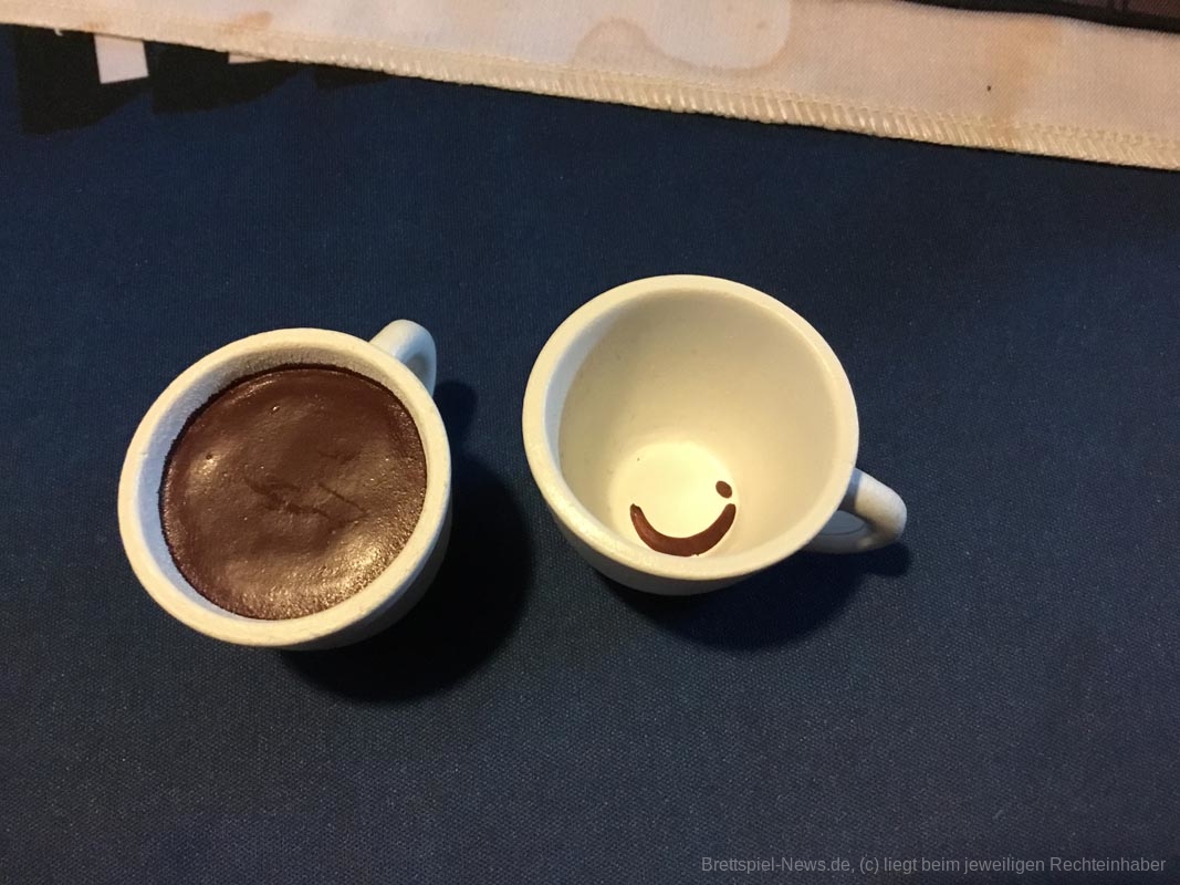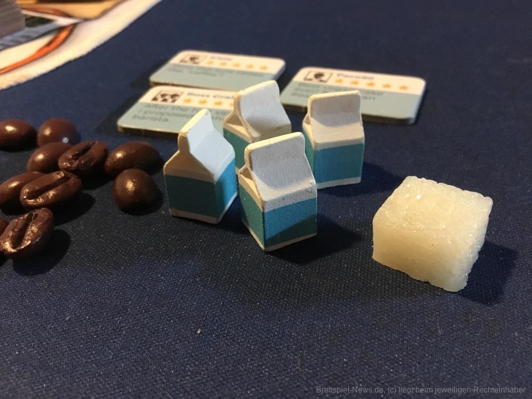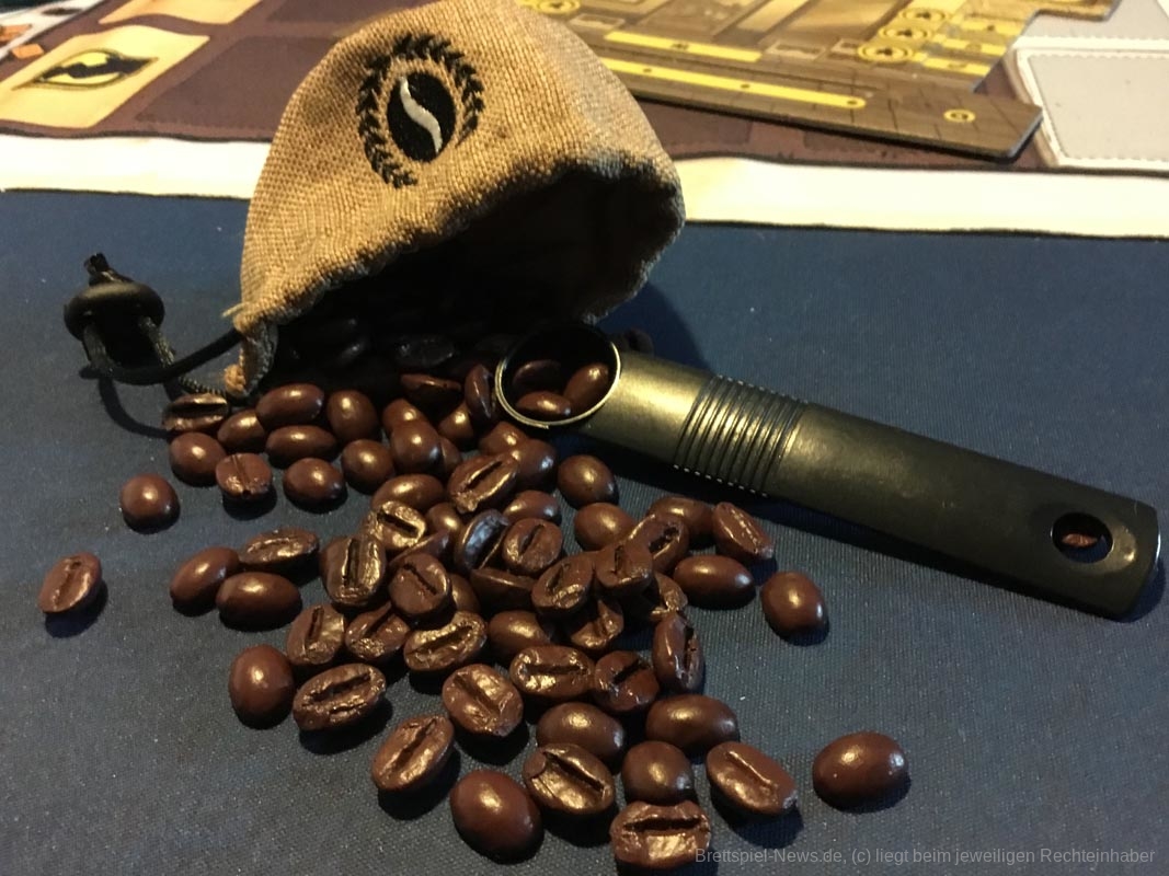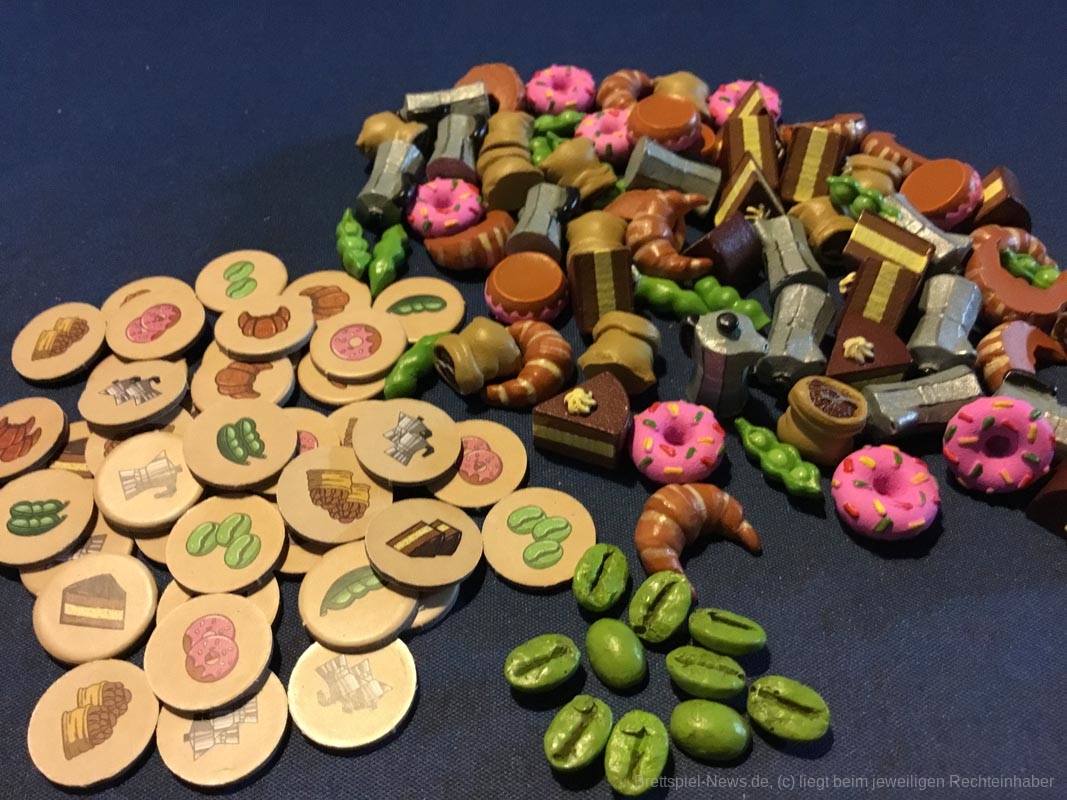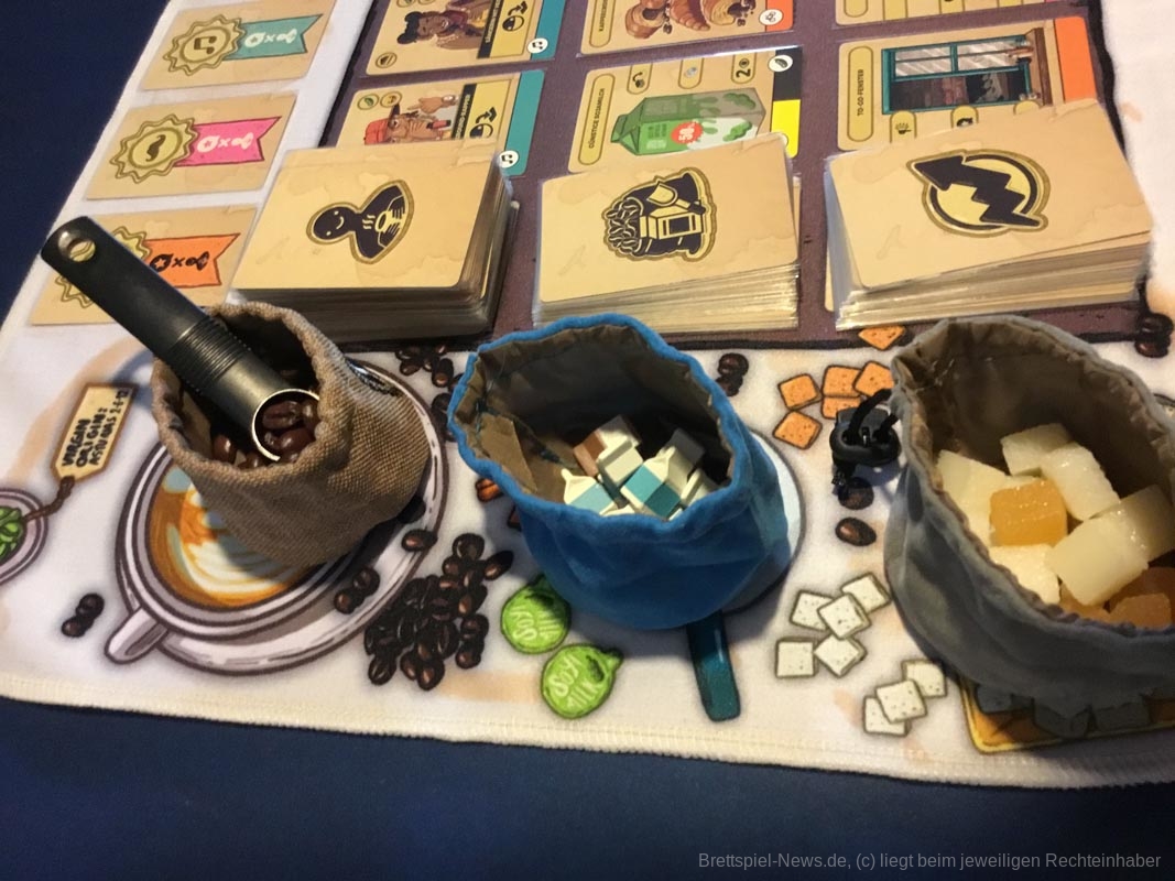 Leider gibt es auch ein paar Kickstarterextras, die nicht alle Kaffeefans bekommen werden. Nötig für ein gelungenes Spielerlebnis ist aber nichts davon. Dazu zählen das Tischtuch mit dem Spielplan, die Ressourcenbeutel, die 3D Kaffeetassen und die 3D Versionen der besonderen Ressourcen (Donut, Croissant, Tortenstück, Sojabohne, Kaffeesack und Espressokocher). Auch ein paar Kundengruppen sind nicht im normalen Spiel enthalten, die möglichen Spielvarianten bleiben aber dennoch riesig.