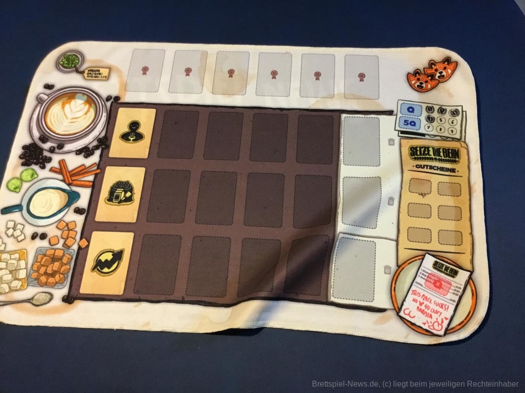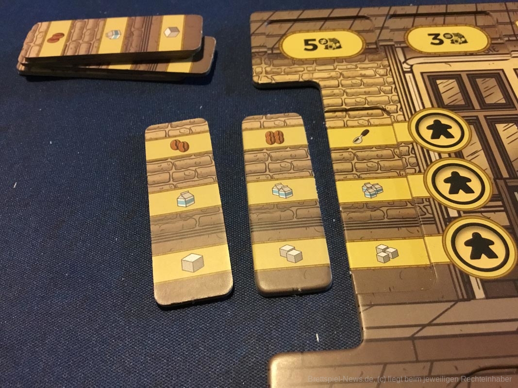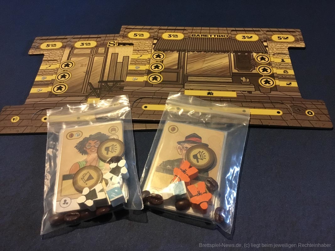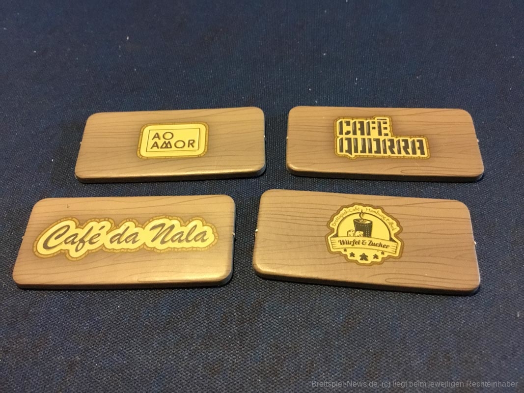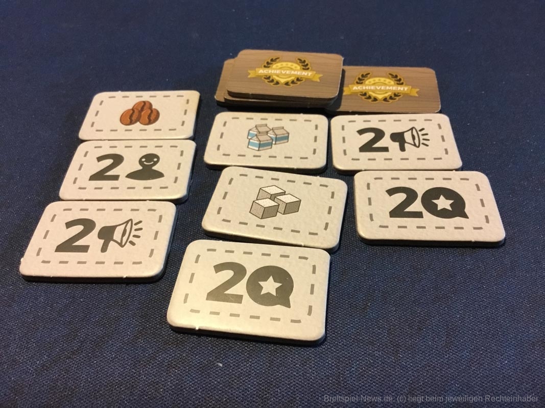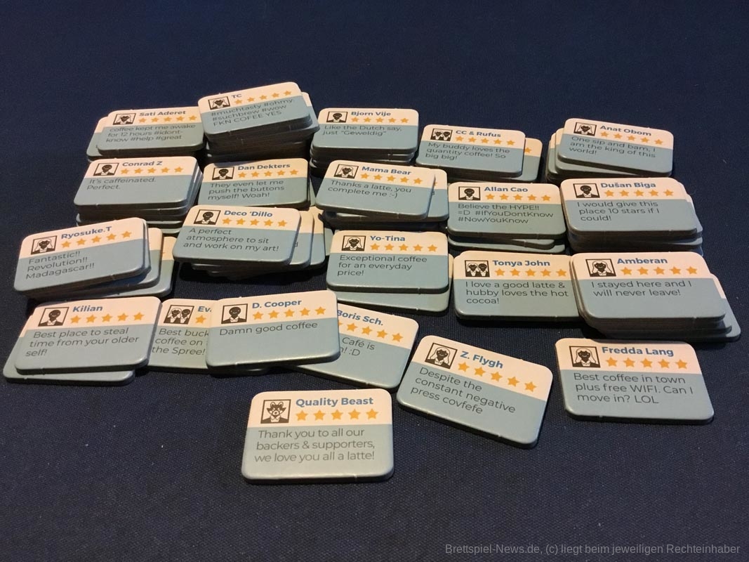 Leider gibt es auch ein paar Kickstarterextras, die nicht alle Kaffeefans bekommen werden. Nötig für ein gelungenes Spielerlebnis ist aber nichts davon. Dazu zählen das Tischtuch mit dem Spielplan, die Ressourcenbeutel, die 3D Kaffeetassen und die 3D Versionen der besonderen Ressourcen (Donut, Croissant, Tortenstück, Sojabohne, Kaffeesack und Espressokocher). Auch ein paar Kundengruppen sind nicht im normalen Spiel enthalten, die möglichen Spielvarianten bleiben aber dennoch riesig.