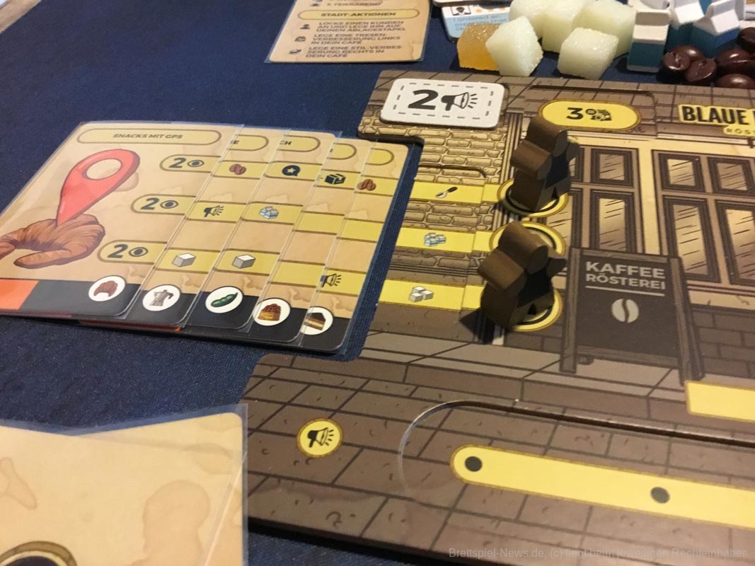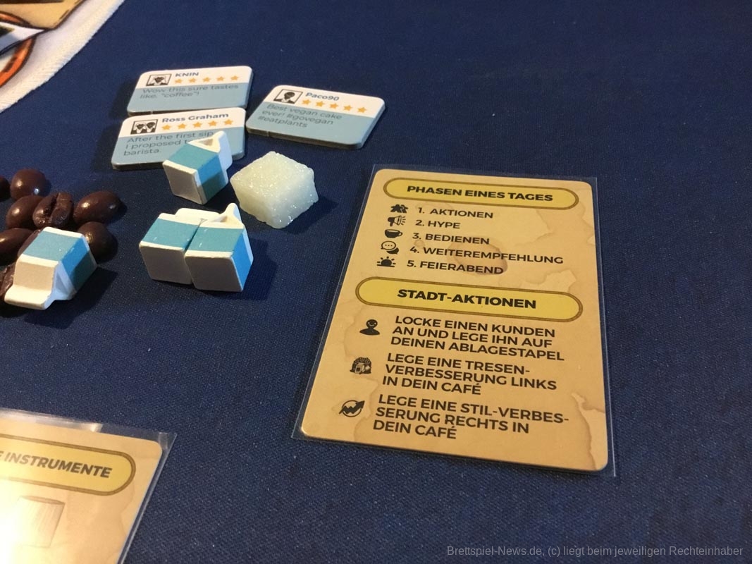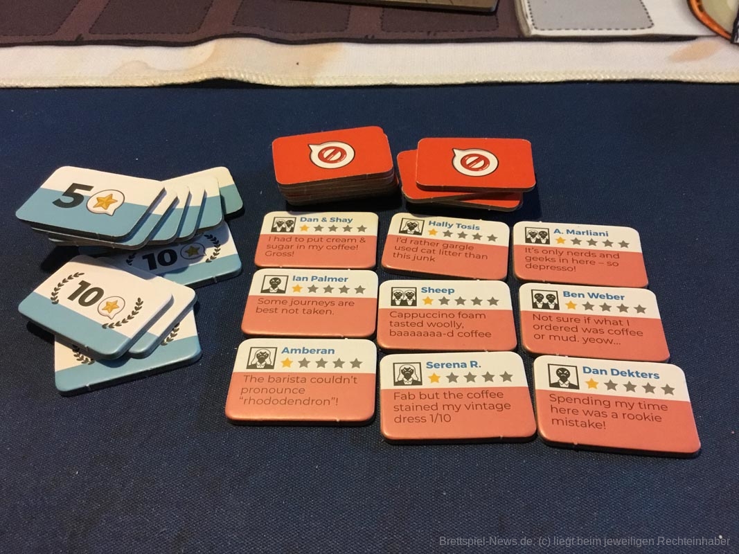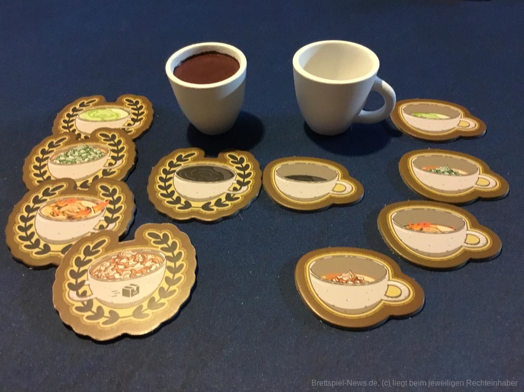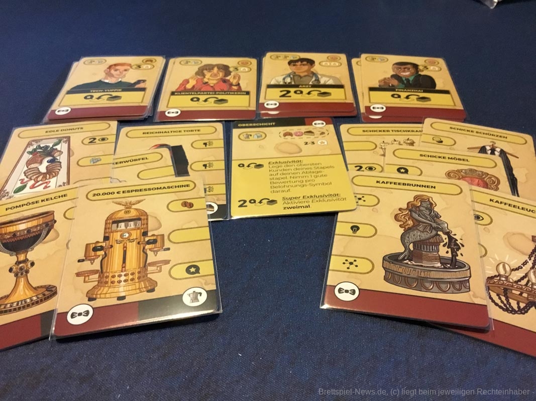 Leider gibt es auch ein paar Kickstarterextras, die nicht alle Kaffeefans bekommen werden. Nötig für ein gelungenes Spielerlebnis ist aber nichts davon. Dazu zählen das Tischtuch mit dem Spielplan, die Ressourcenbeutel, die 3D Kaffeetassen und die 3D Versionen der besonderen Ressourcen (Donut, Croissant, Tortenstück, Sojabohne, Kaffeesack und Espressokocher). Auch ein paar Kundengruppen sind nicht im normalen Spiel enthalten, die möglichen Spielvarianten bleiben aber dennoch riesig.