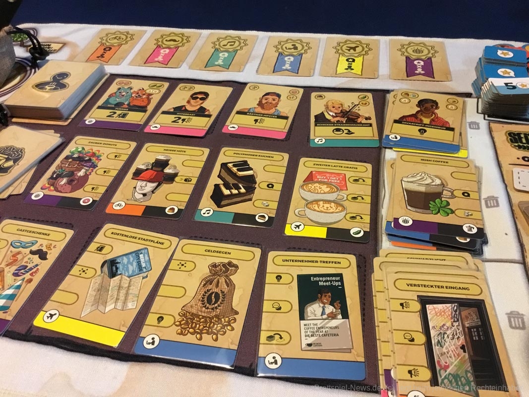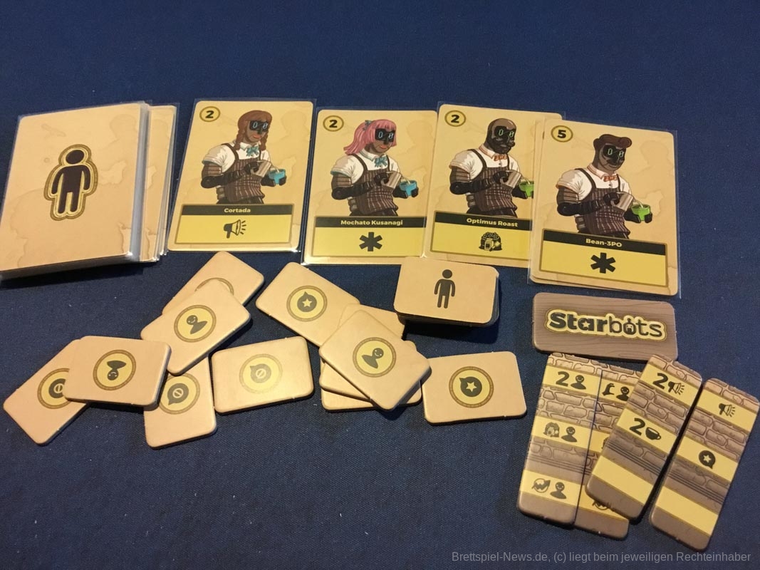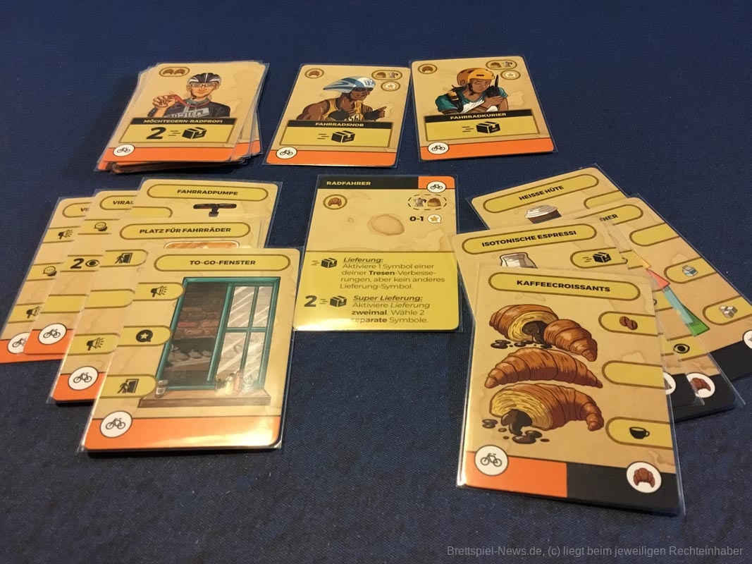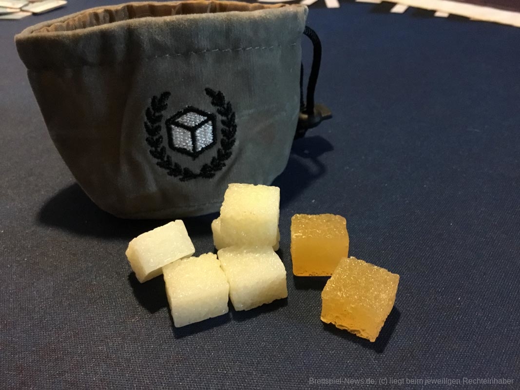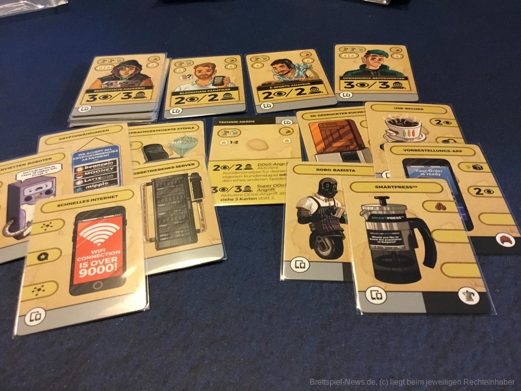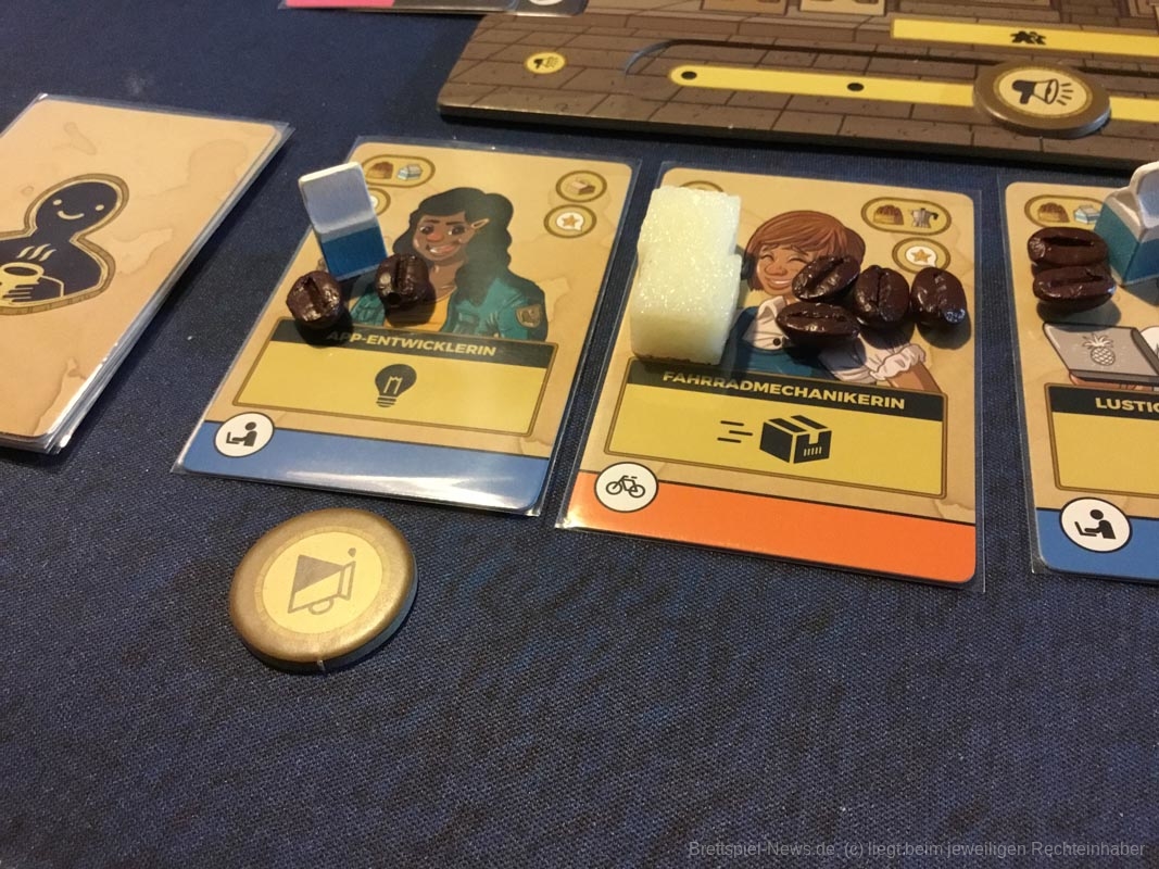 Leider gibt es auch ein paar Kickstarterextras, die nicht alle Kaffeefans bekommen werden. Nötig für ein gelungenes Spielerlebnis ist aber nichts davon. Dazu zählen das Tischtuch mit dem Spielplan, die Ressourcenbeutel, die 3D Kaffeetassen und die 3D Versionen der besonderen Ressourcen (Donut, Croissant, Tortenstück, Sojabohne, Kaffeesack und Espressokocher). Auch ein paar Kundengruppen sind nicht im normalen Spiel enthalten, die möglichen Spielvarianten bleiben aber dennoch riesig.