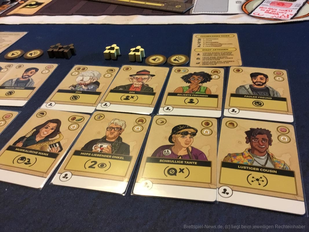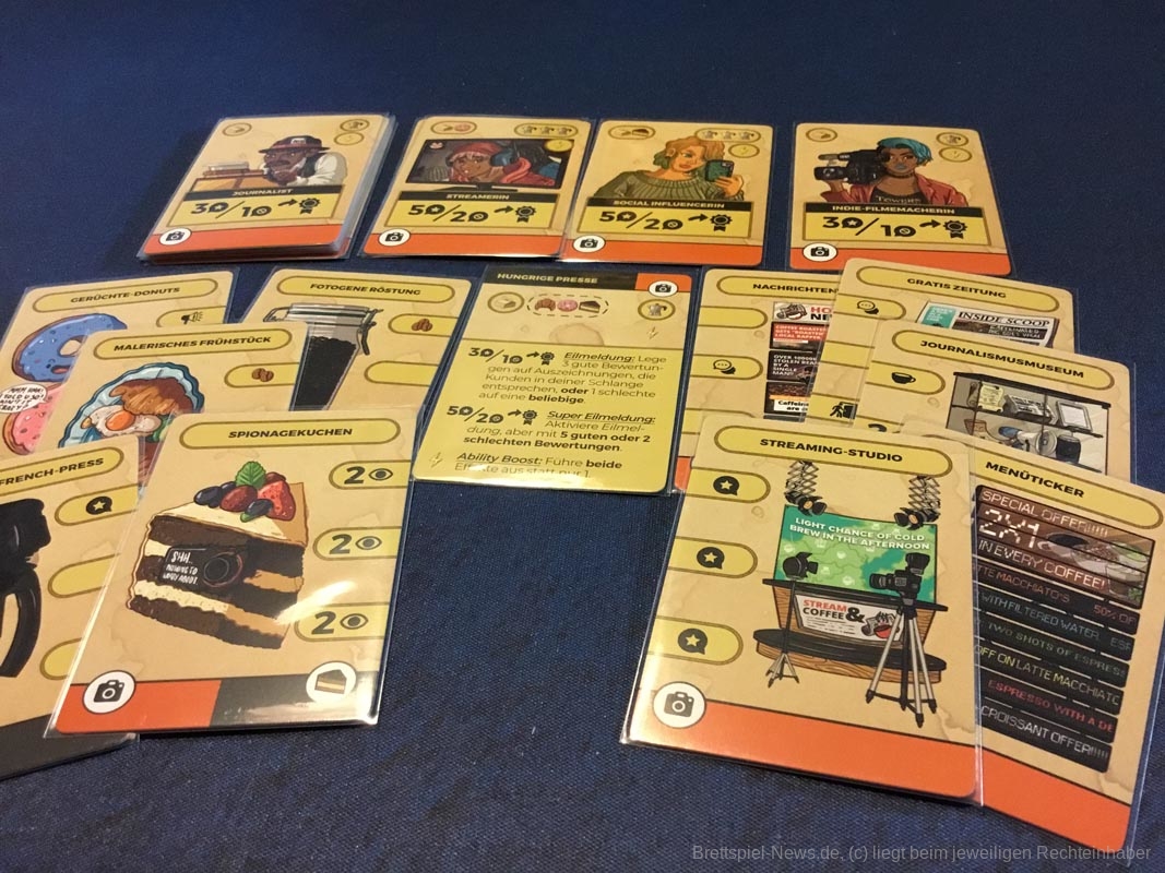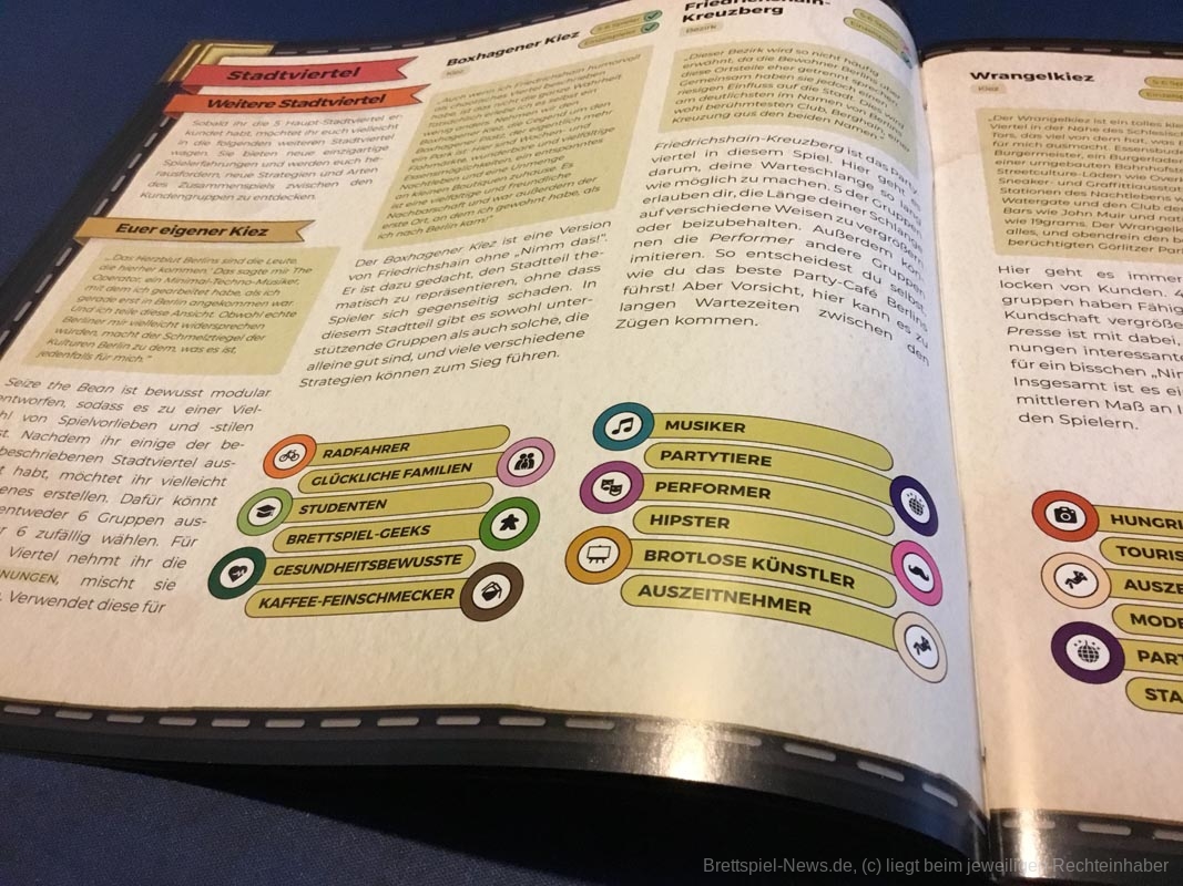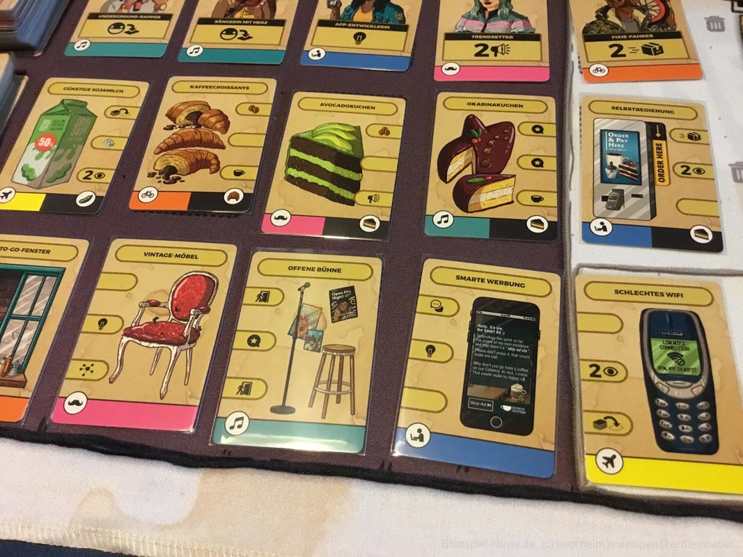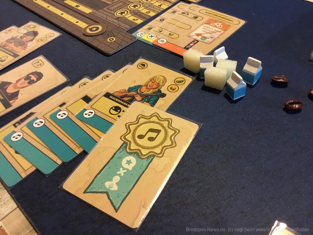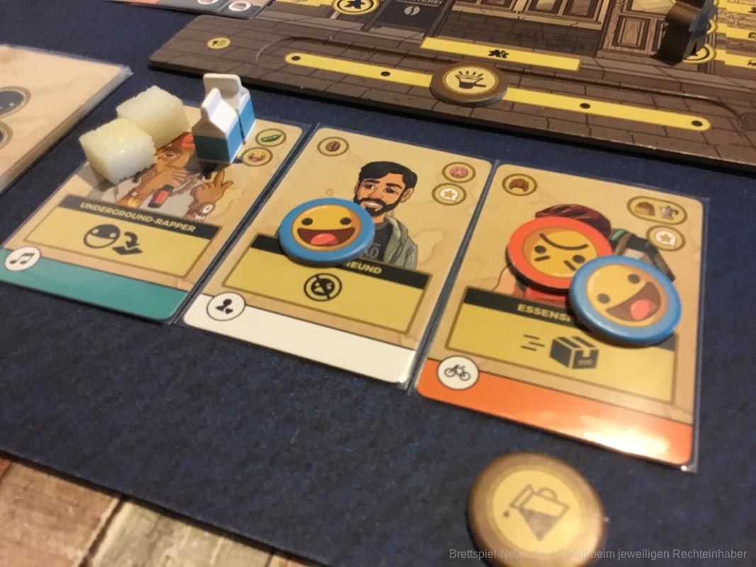 Der Wiederspielwert ist sehr hoch, denn je nach verwendeten Kundengruppen ändert sich das Spiel völlig. Im Spiel mit Hackern, Verbechern und Ordnungskräften stehlen die Spielerinnen und Spieler sich Ressourcen, verhaften Kunden ihrer Konkurrenz oder treiben Schindluder mit ihren Nachziehstapeln. Modefans und Oberschicht lassen den Nachziehstapeln rotieren und verhelfen zu Punkten, ohne dass irgendjemand bedient wird. Die hungrige Presse torpediert die Mehrheitenwertung am Spielende, indem gute und schlechte Bewertungen auf Kundengruppen gelegt werden. In der Anleitung finden sich diverse Empfehlungen für interessante Kundenkombinationen aus verschiedenen Stadtteilen Berlins. Darüber hinaus gibt es einen Roboter-Barista als Gegner für Solo-Spielerinnen und -spieler. Die Familienmitglieder können zu Beginn gedraftet werden und mit Plättchen für die linke Caféseite können die erhältlichen Ressourcenmengen angepasst werden. Kurz gesagt: Es steckt wirklich sehr viel Spiel in dieser kompakten Schachtel.