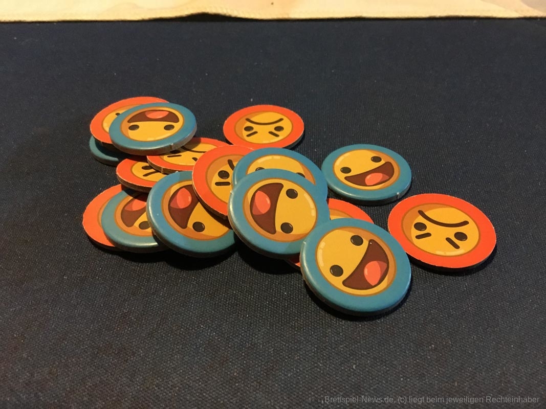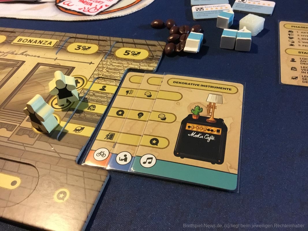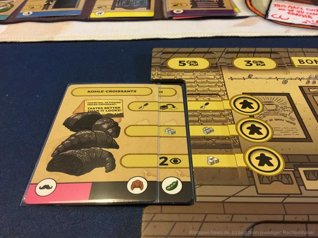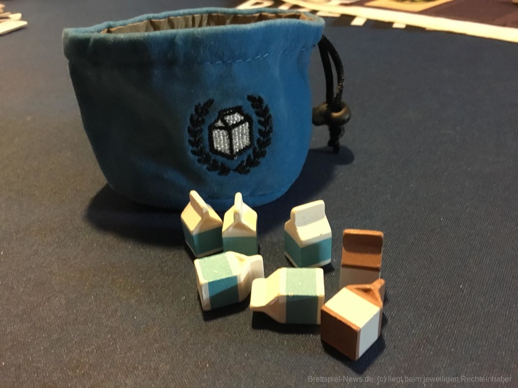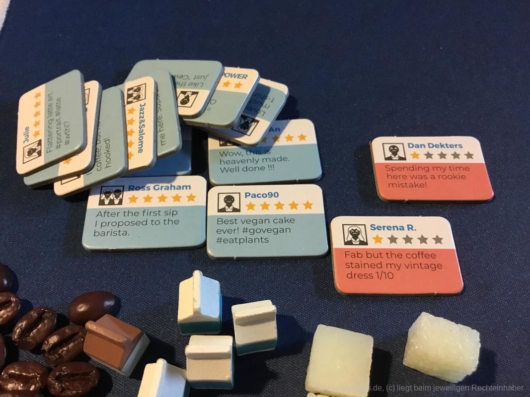 Wahrhaft besonders und absolut beeindruckend ist das Spielmaterial. Die Kaffeebohnen, Zuckerwürfel und bemalten Milchtüten stechen heraus und fesseln ans Thema. Ich habe in meinem Leben noch jede Partie „Catan“ verloren, weil ich mich lieber im Ausbau der Dörfer verliere, anstatt Siegpunkte zu sammeln. Insofern holt mich „Seize the bean“ komplett ab. In allen Partien waren die Spielerinnen und Spieler beeindruckt und das Angeln nach möglichst vielen Kaffeebohnen mit dem Kaffeelöffel wurde zum Spiel im Spiel. Der feine Humor auf den einzigartig gestalteten Karten tut sein Übriges. Da ist die WLAN Verbindung über 9000! Und im Kartenset der Verbrecher finden sich verdächtig viele nicht gestohlene Gegenstände. Die Texte der Bewertungsplättchen stammen von den Unterstützern der Kickstarterkampagne. Darunter findet sich nicht nur eine Danksagung des Verlages, sondern sogar ein Trump-Zitat. Auch hier ist die Liebe fürs Detail spürbar.