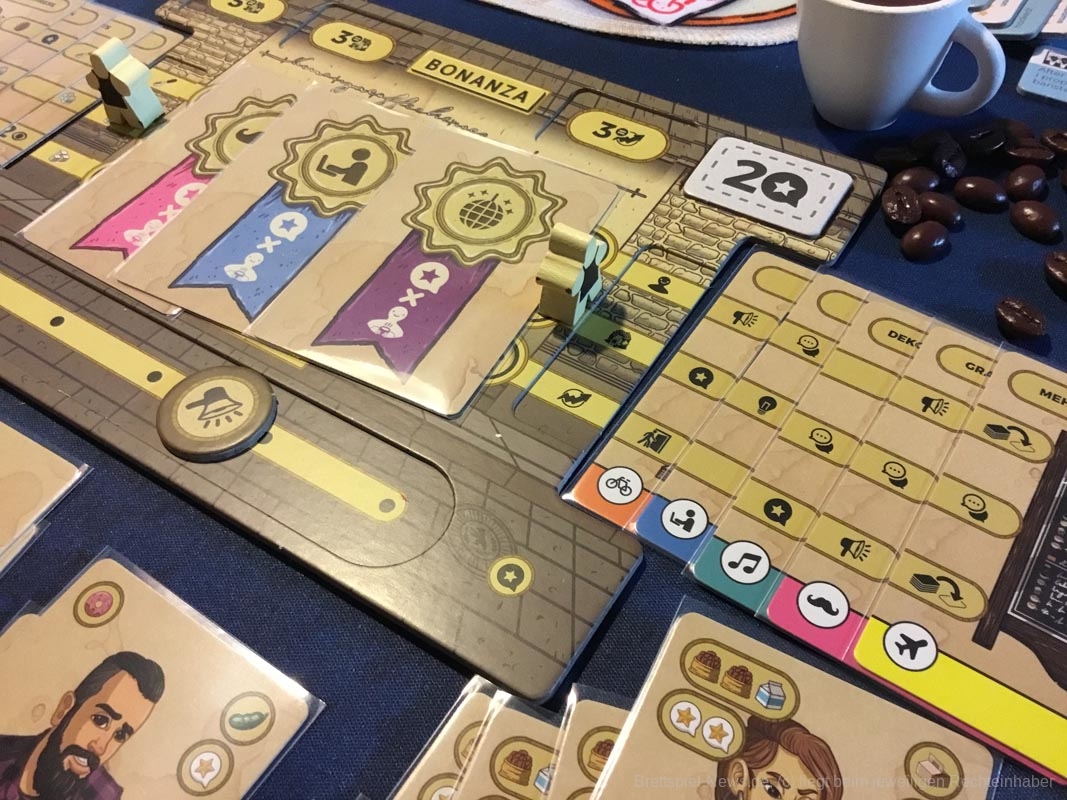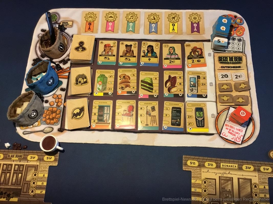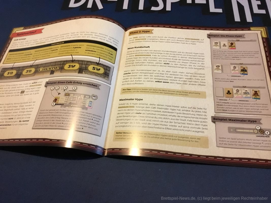 Rein mechanisch macht „Seize the bean“ nichts neu. Egal ob Arbeiter einsetzen, Kartendeck ausbauen oder clevere Kombinationen für maximale Punkteausbeute finden; das alles findet sich auch in anderen Spielen. Doch in Verbindung mit dem Thema und den Materialien ist es eben doch etwas Besonderes. Der Rundenablauf ist intuitiv logisch. Die Ikonographie ist schnell erlernt. Die Anleitung bietet sowohl eine ausführliche, als auch eine kurze Erklärung und lässt keine Fragen offen. Lediglich das Bedienen der Kundinnen und Kunden kann etwas länger dauern, speziell im späteren Spielverlauf. Vieles lässt sich allerdings gleichzeitig abhandeln, lange Wartezeiten gibt es selten.
