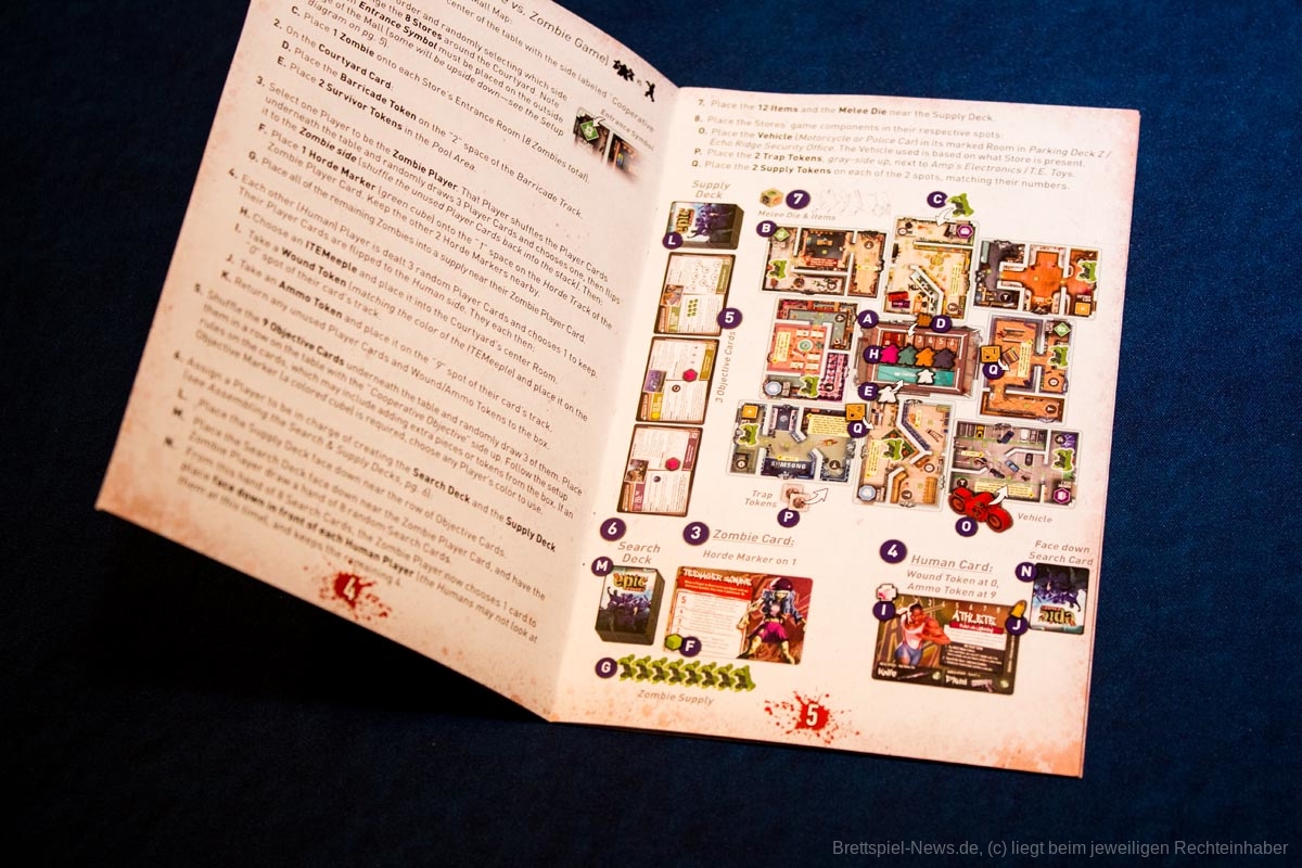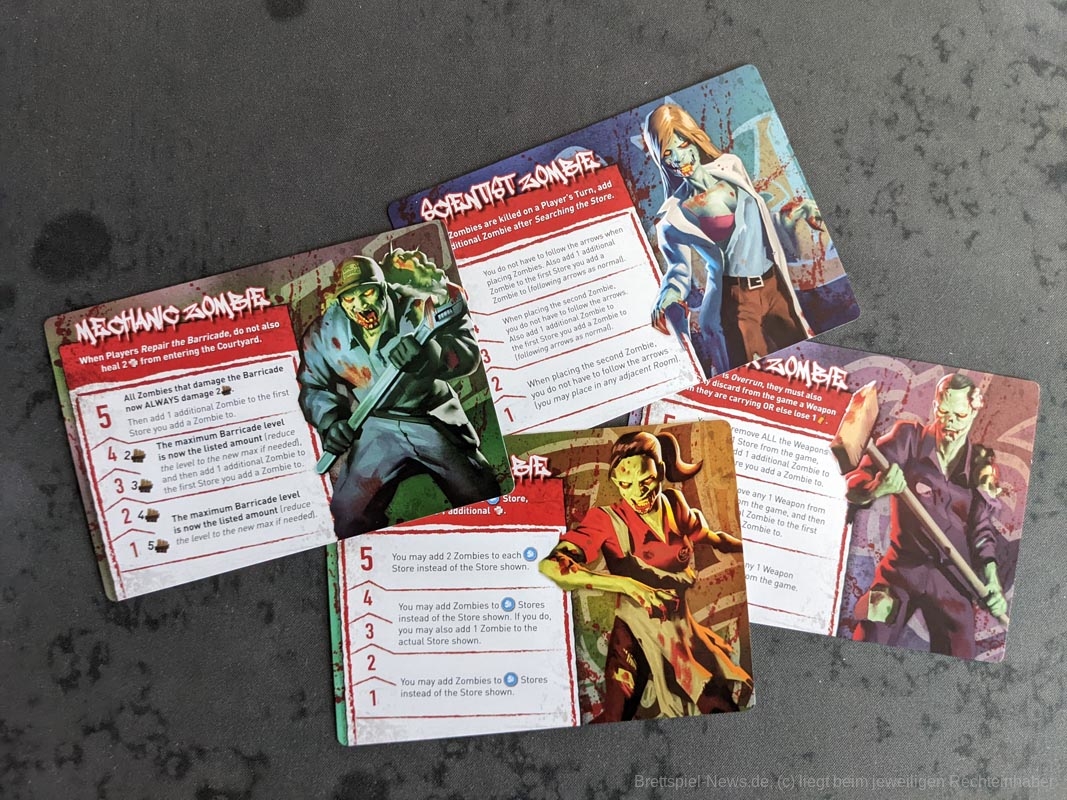 Der Hauptmodus des Spiels wird gegen eine Person gespielt, welche die Zombies steuert. Laut Beschreibung soll erst hier die richtige Spannung aufkommen, da die von Spielerinnen und Spielern gespielten Zombies die Menschen vor eine richtige Herausforderung stellen sollen. Für uns war dieser Modus aber leider eine einzige Enttäuschung und sorgte für viele Frustmomente. So fühlten sich in einem Spiel die Zombiefähigkeiten viel zu stark an und die Barrikade wurde bereits im zweiten Zug zum ersten Mal eingerissen. Während hier auf Seiten des menschlichen Teams zumeist Frustration herrschte, war es als Zombie recht langweilig, da schnell klar wurde, welche Übermacht auf dem Spielfeld herrschte. Da half auch der Einsatz der Armee nichts, die einen Shop und die darin befindlichen Zombies dem Erdboden gleich machte. Auch die Aktionen des Zombies sind sehr eingeschränkt, da man einfach nur verdeckte Karten an die Menschen verteilt und damit entscheidet, in welchem Geschäft Zombies auftauchen.