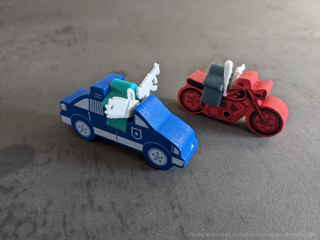„Tiny Epic Zombies” lässt uns etwas ratlos zurück. Wir haben bisher kein anderes Spiel der Tiny-Epic Reihe gespielt und darum haben wir uns sehr über die kleine Schachtel mit dem schier endlosen Spielmaterial gefreut. Das Material ist hochwertig, die Meeple schön bedruckt und wenn das eigene Meeple, bestückt mit allerhand Waffen das große Holzmotorrad besteigt, fühlt man sich mitten in eine Zombieapokalypse verschlagen. Auch die thematische Umsetzung ist größtenteils gelungen, auch wenn der auf der Spielschachtel versprochene „brutale Kampf ums nackte Überleben“ wohl etwas übertrieben ist.