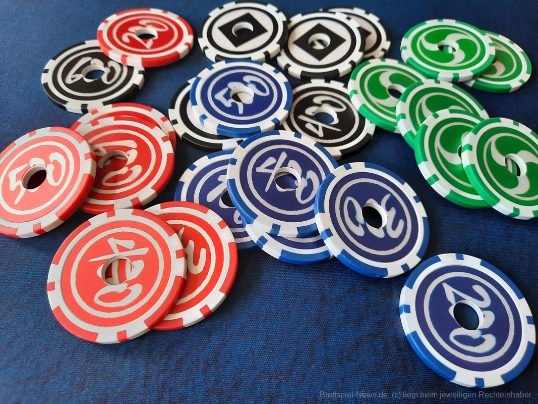 Das Werfen der Chips macht sehr viel Spaß, weil das Spielmaterial entsprechend gut ist. Der Spielplan ist groß, schön gestaltet und hat eine extra Pappschicht als Rahmen am Rand. So kann auch mal gezielt über Bande gespielt werden, was auch sehr gut funktioniert, da die Chips wirklich Gewicht haben. Aber das eigentlich spannende ist der Marktmechanismus. Da die Chips verschiedene Werte haben, können gezielt die Preise manipuliert werden. Und da sie verdeckt geworfen werden, kann eine scheinbare Preiserhöhung nur ein Bluff sein. Doch diese strategische Marktmanipulation hängt letztendlich vom eigenen Geschick und dem der anderen ab. Mein Plan kann einfach zerstört werden, wenn eine andere Person meinen Chip von der Schale meiner Wahl herunterschießt. Hier wird Spannung erzeugt und wer sich mitreißen lässt, steht mit einem breiten Grinsen am Tischrand und beäugt die Versuche der anderen. Lustig, wenn es mal in die Hose geht und ein Grund für einen kleinen Freudensprung, wenn der Chip genau planmäßig landet.