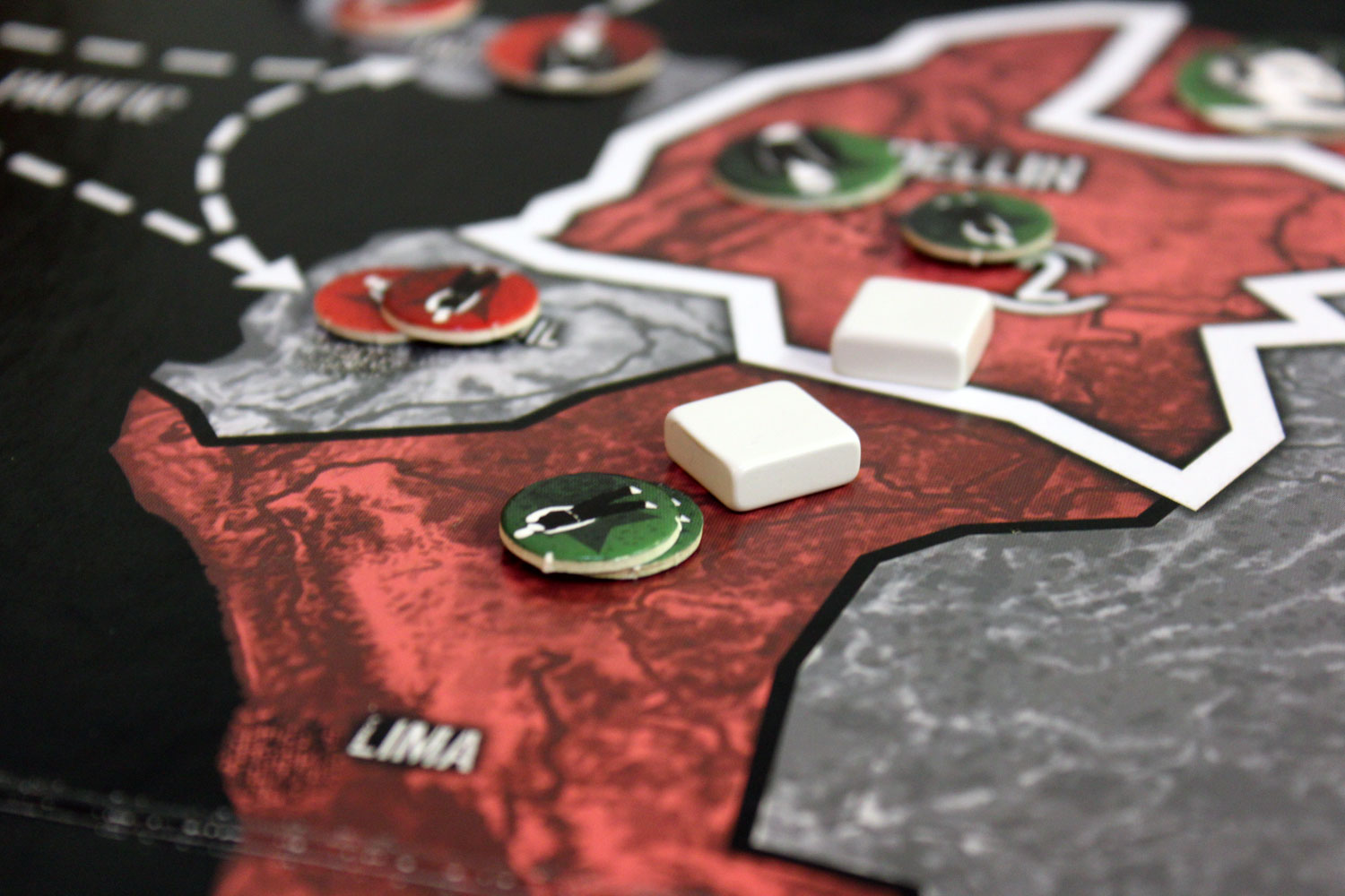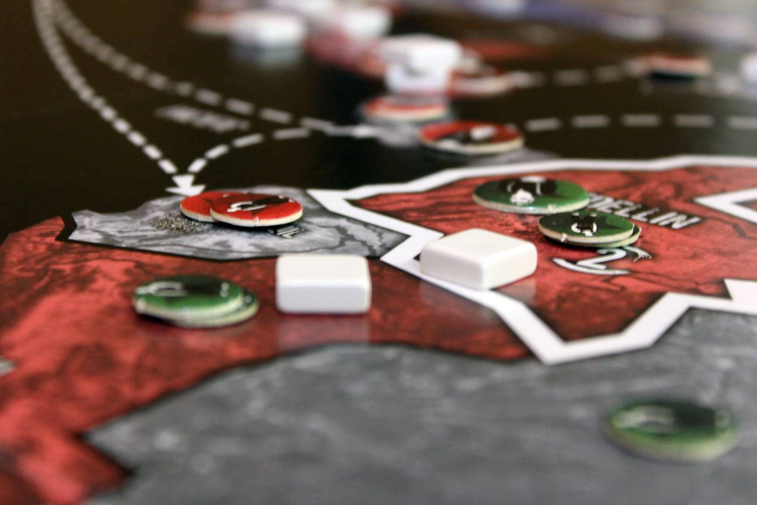 Mit der “Aktions-Phase” kommt Bewegung ins Spiel. Nacheinander dürfen sich die Soldaten und der Boss ein Feld weit bewegen. Der Lieutenant hat eine Reichweite von zwei. In dieser Phase kommt es dann oft zu blutigen Bandenkämpfen. Sobald sich zwei Kartelle in einem Feld treffen, bricht der Kampf aus. Auch Städte müssen beim ersten Betreten von unbekannten Banden erkämpft werden.