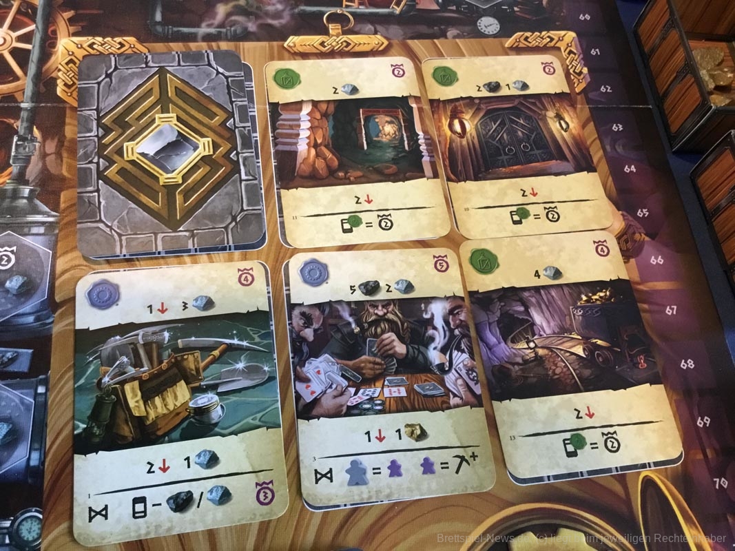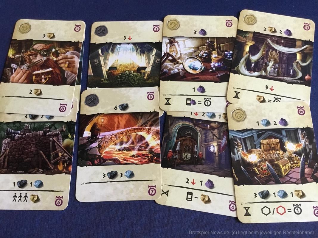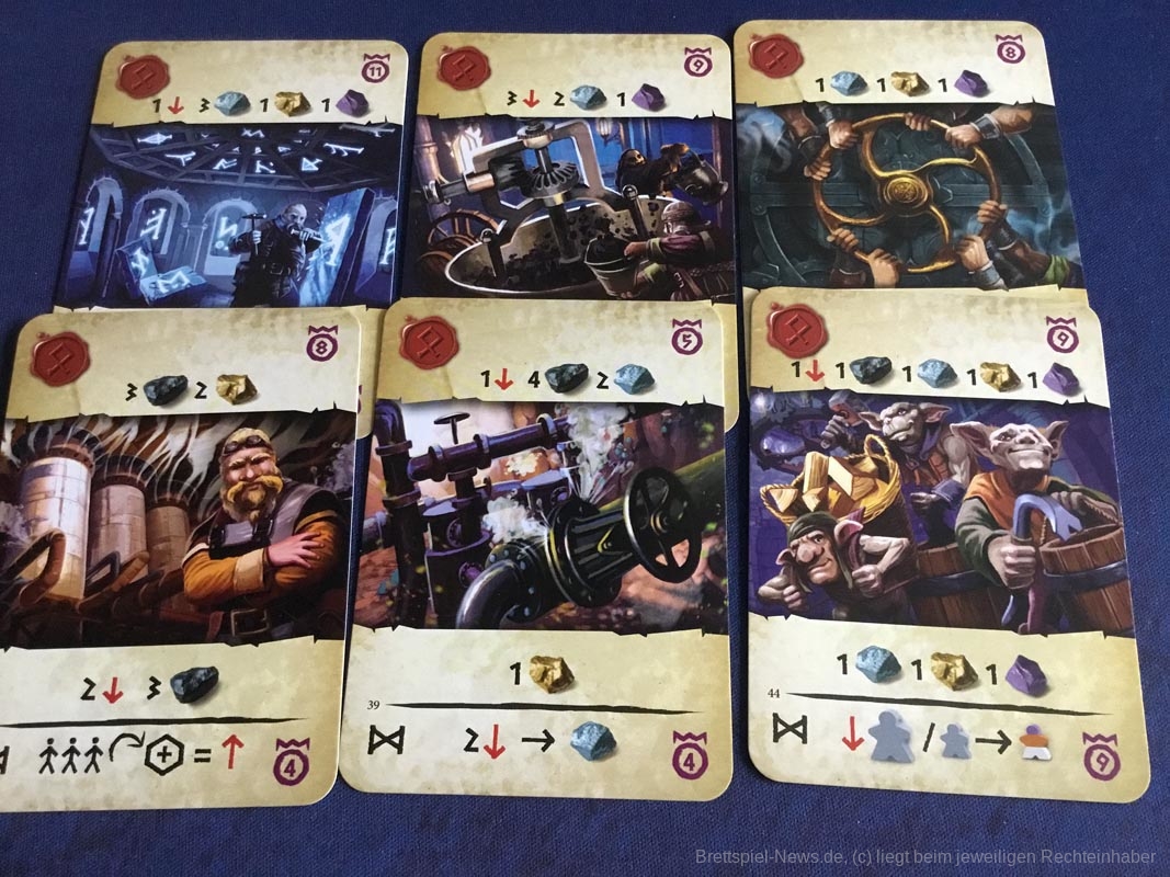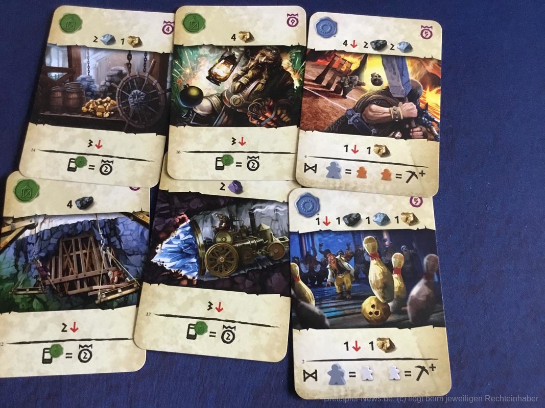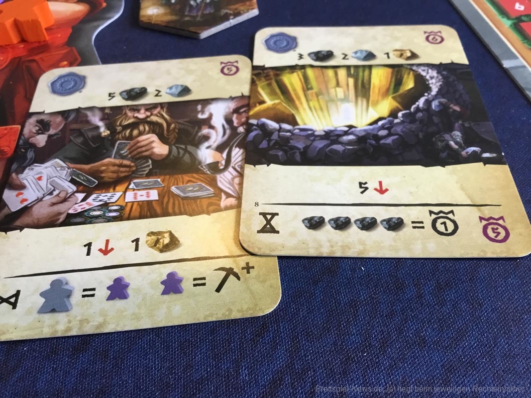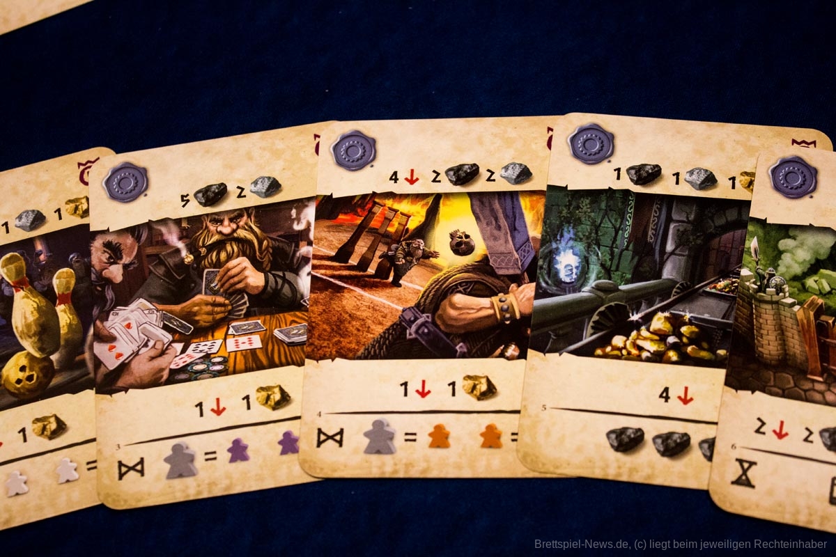 Und an dieser Stelle muss ich mit einer Lüge aufräumen. Es gibt im Spiel keine Kohle. Laut Anleitung ist es Stein. Aber warum Zwerge Steine als Rohstoff in Minen abbauen sollten, leuchtete niemandem ein. Und da stets alle die schwarzen Brocken sofort als Kohle identifizierten, habe ich das einfach nicht mehr korrigiert. Die Projektkarten wirken auch nach mehreren Partien noch unausgeglichen. Manche sind sehr günstig und bringen mit jeder Karte aus dem Set mehr Punkte. Andere haben eher schwache Effekte, kosten dafür aber obszöne Rohstoffmengen. Diese Unausgeglichenheit kommt besonders in kurzen Spielen deutlicher zum Tragen, weshalb ich eigentlich nur die lange Version empfehlen kann.