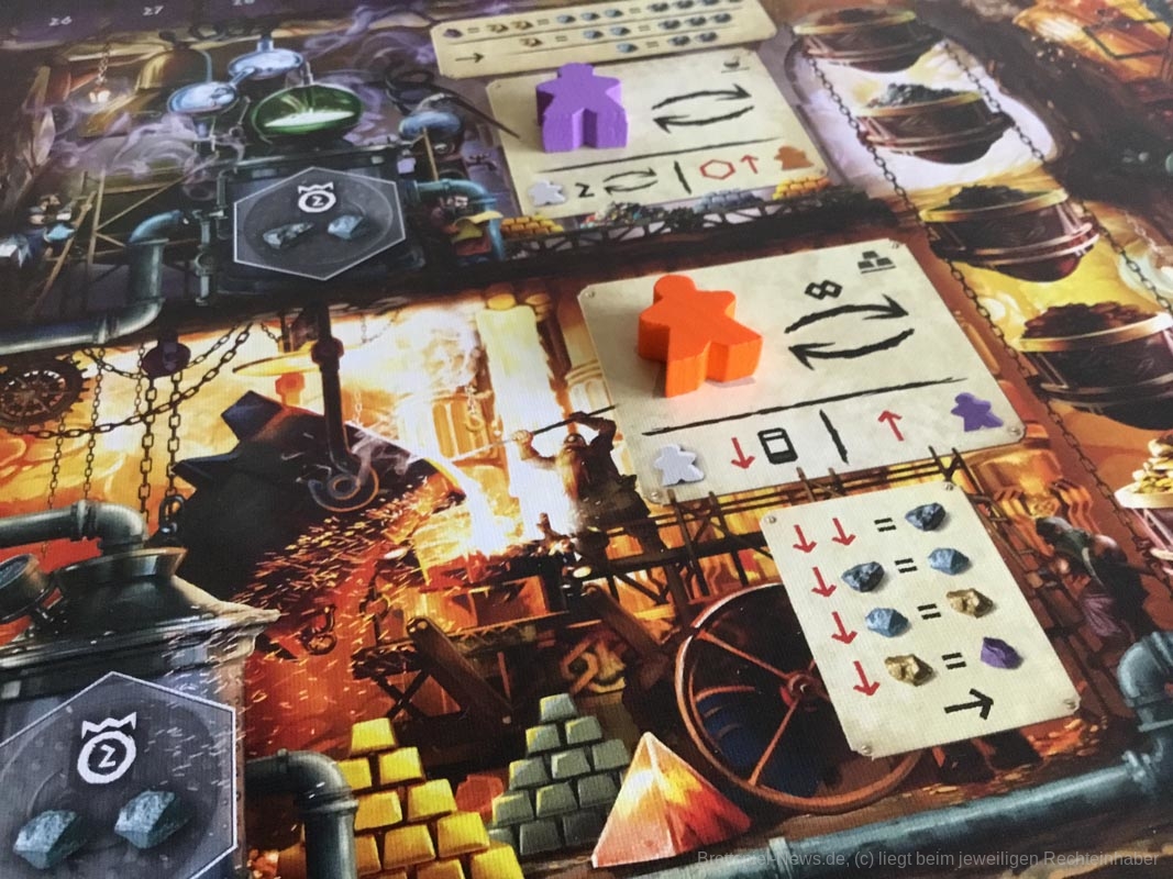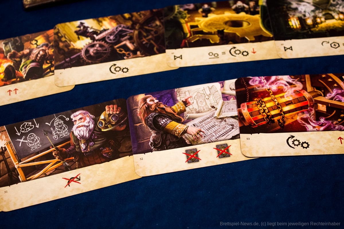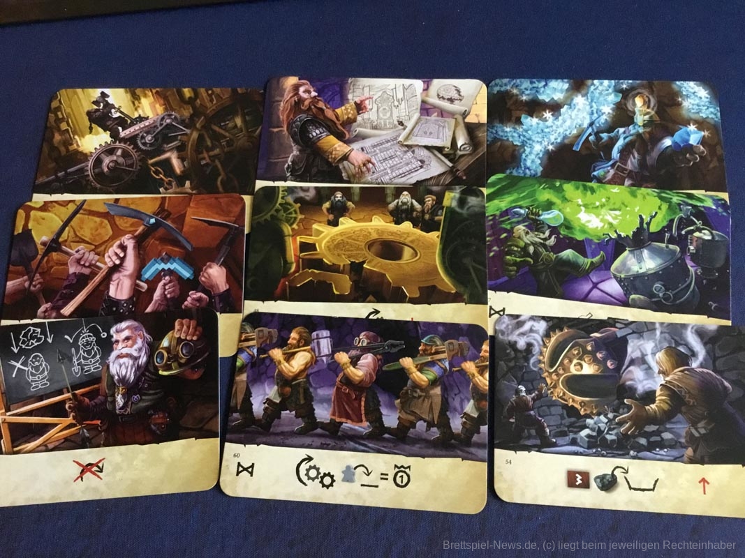 Das Zwergar-Konstrukt funktioniert recht gut und alles in allem ist es ein gelungenes, simples und schnell gespieltes Arbeiter-einsetz-Spiel. Die Gestaltung der Karten ist sehr gut und neben vielen Rohren und Öfen finden auch immer wieder kleine popkulturelle Anspielungen Platz in den Bildern. Als begeisterter Zwergenfreund, konnte ich mich allerdings nur bedingt mit dem Spiel anfreunden, denn es gibt da schon ein paar kleine Steinchen im großen Getriebe…