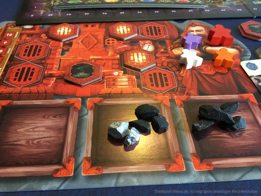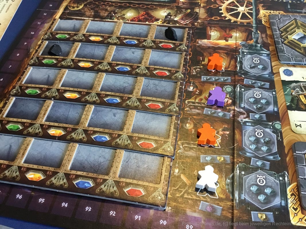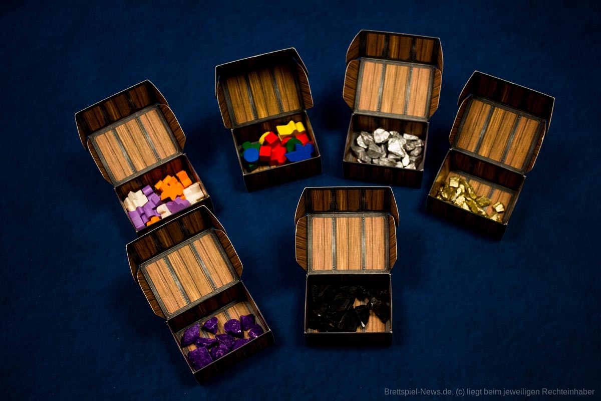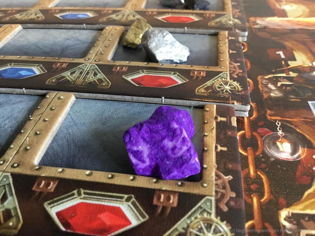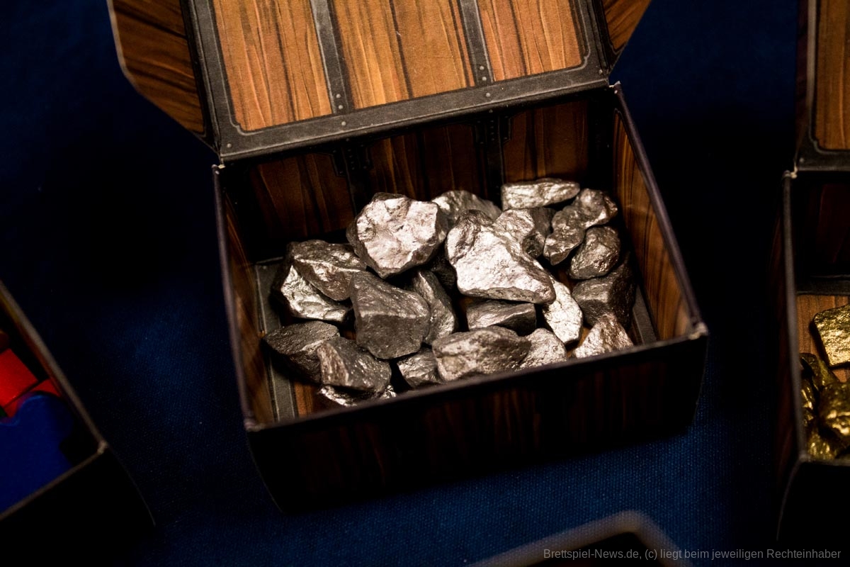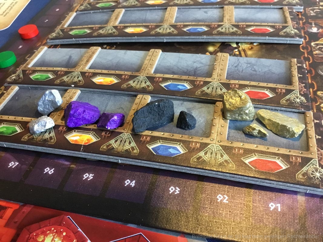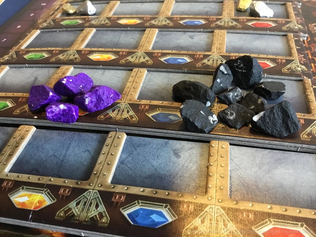 Die Idee bemalte Steine als Ressourcen zu verwenden, mag sich aus umweltfreundlichen Gründen gut klingen, allerdings sind alle Brocken sehr unterschiedlich in ihrer Größe. Besonders bei den matten Juwelen und der Kohle fallen die Stellen sehr schnell auf, an denen ganze Teile abbrechen. Da helfen auch die kleinen Schachteln nicht, die dem Spiel beiliegen.