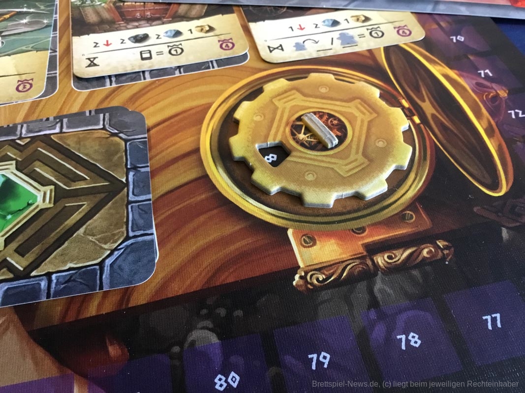 Die besondere Kernmechanik von „Zwergar“ ist der Ressourcenaufzug der Mine. Die dicken Lorenplättchen fördern ständig neue Rohstoffe zutage und ermöglichen so das Voranschreiten auf der Punkteleiste. Besonders sind auch die kleinen bemalten Steine, die als Ressourcen im Spiel dienen. In dieser surrenden Maschinerie läuft alles nur so lange wie geschmiert, wie die Spielerinnen und Spieler den Spagat zwischen Ressourcen beschaffen und ausgeben auch hinbekommen. Schnell kann ein beabsichtigtes Projekt an die Konkurrenz gehen und man gerät auf der Punkteleiste ins Hintertreffen. Für einen Zwerg gibt es scheinbar nichts Schlimmeres als Ineffizienz.