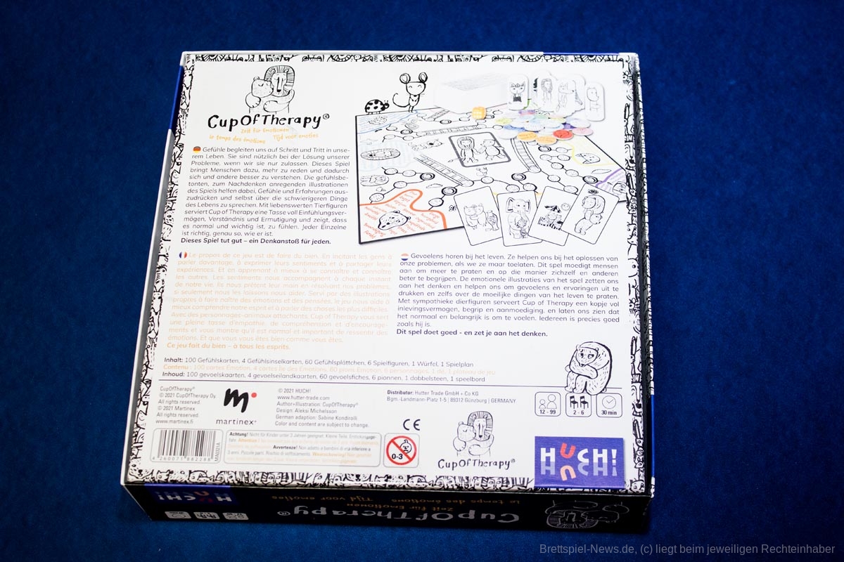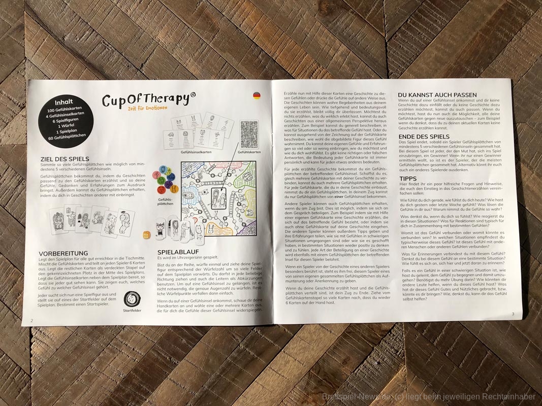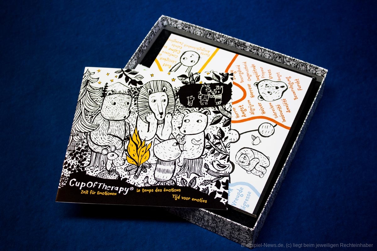 „Cup of Therapy“ hat mich sofort überzeugt. Bereits das liebevoll gestaltete Material ist von vorne bis hinten durchdacht. Gerade bei den tollen Zeichnungen auf den Gefühlskarten merkte ich, dass viel Liebe in die Produktion des Spieles geflossen ist. Die Regeln sind sehr leicht und in drei Sprachen verfasst.