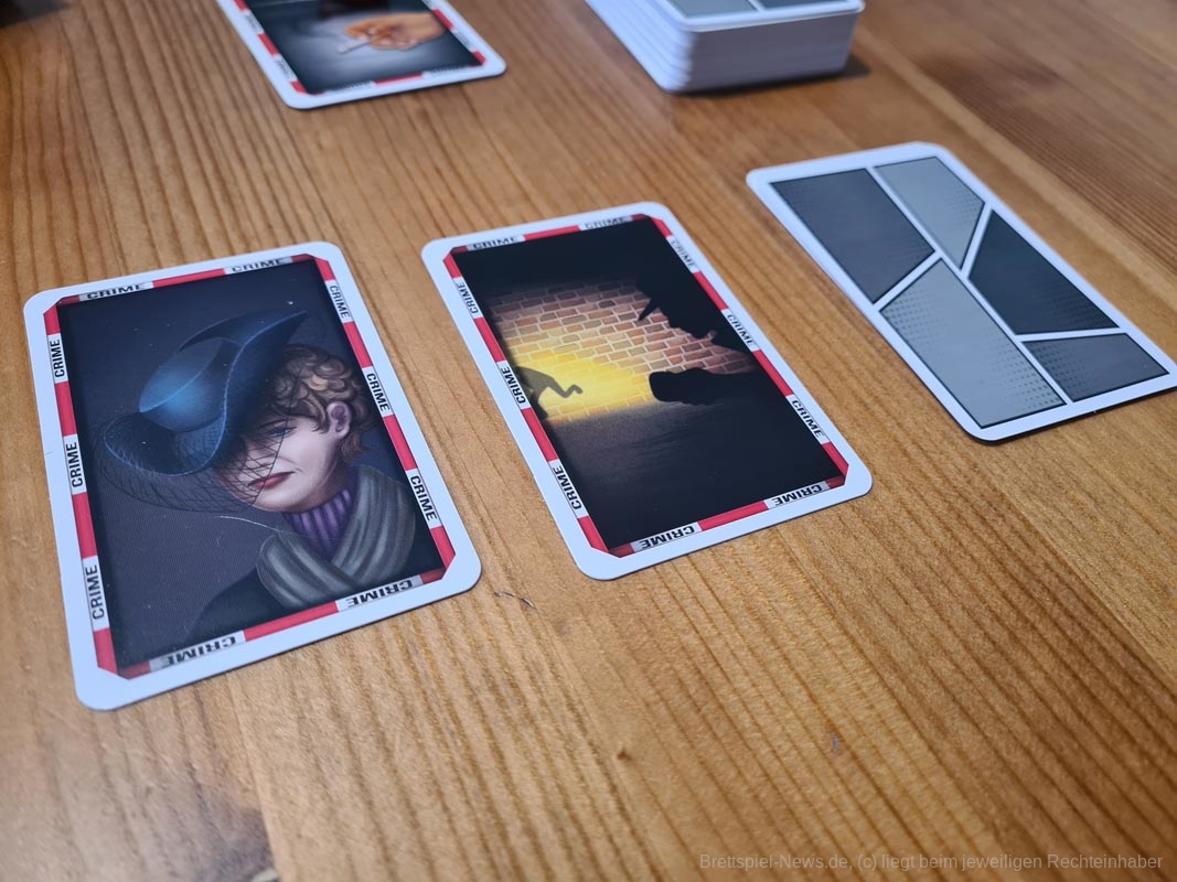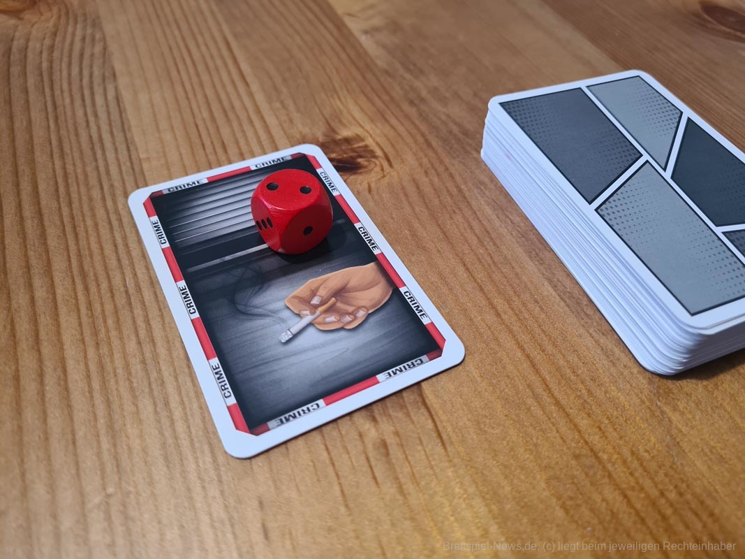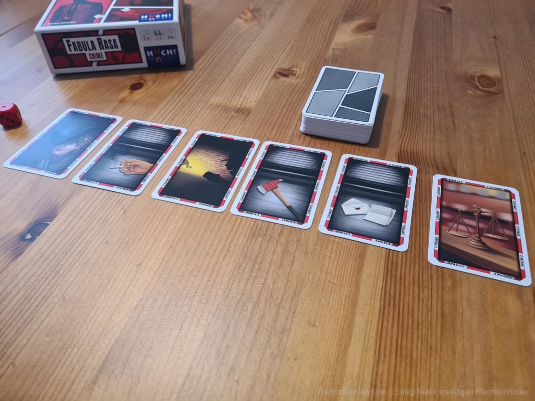 „Fabula Rasa - Crime“ gehört in die Kategorie „aus wenig mach viel“. Insgesamt 55 Bildkarten und ein Würfel - mehr ist nicht nötig, um „Fabula Rasa - Crime“ spielen zu können, was mich immer wieder fasziniert. Auch aus diesem Grund ist das Spiel an sich superleicht zu erklären und zu spielen. Jede Spielgruppe weiß beinahe sofort, was zu tun ist, wodurch der Spielfluss fast gar nicht durch Regelfragen gestört wird. Auch die Bildkarten an sich sind so gestaltet, dass sie die Fantasie der Erzählenden anregen und in den meisten Fällen nicht nur eine Bedeutung beinhalten. Etwas schade ist, dass die Spielschachtel für das sehr limitierte Spielmaterial völlig überdimensioniert ist. Sie hätte mehr als halbiert werden können.