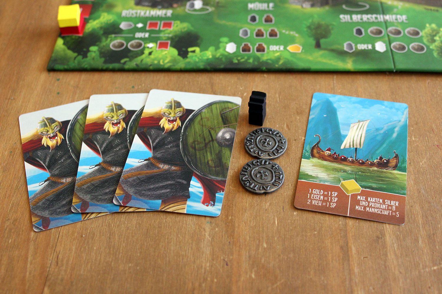Die Darbietungskarten werden gemischt und die obersten drei werden am “Lagerhaus” ausgelegt. Die Walküren und Beute wie Gold, Eisen und Gold kommen in den Stoffbeutel. Dann wird auf die Beutefelder entsprechend der aufgedruckten Zahlen zufällige Beute ausgelegt. Der Rest der Beute wird neben das Spielfeld gelegt. Dort landen auch die Münzen und die Proviantmarker. Nun werden noch die weißen und grauen Arbeiter auf die markierten Felder gestellt und das Spiel kann starten. Der Startspieler wird zufällig bestimmt.