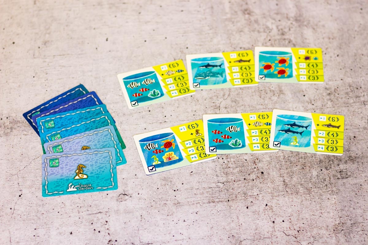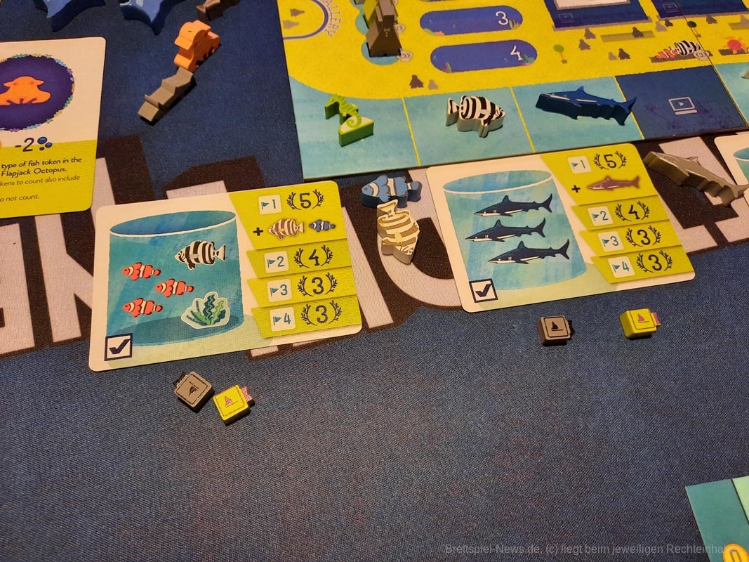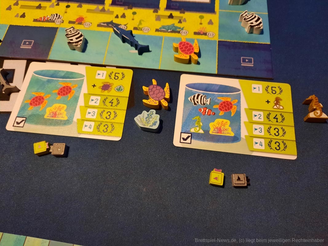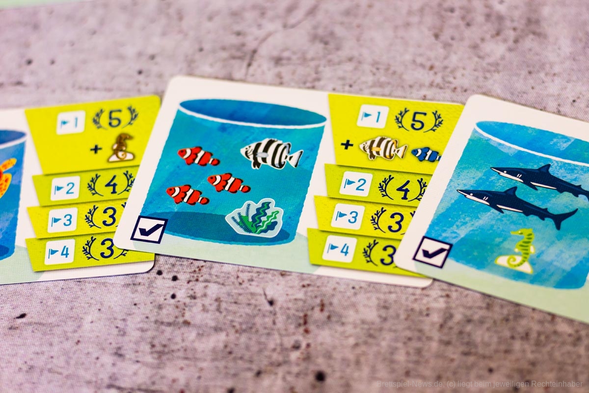 Das ist auch nötig, um einige der Meilensteine zu erfüllen. Unter der Aquariummesse liegen Karten mit besonderen Konstellationen, die in einem Tank vorhanden sein müssen, damit ein eigener Marker auf diese Karte gelegt werden darf. Das Erfüllen eines Meilensteins bringt Punkte und sogar extra Meeresbewohner, sollte man die erste Person sein, die diese Aufgabe meistert.